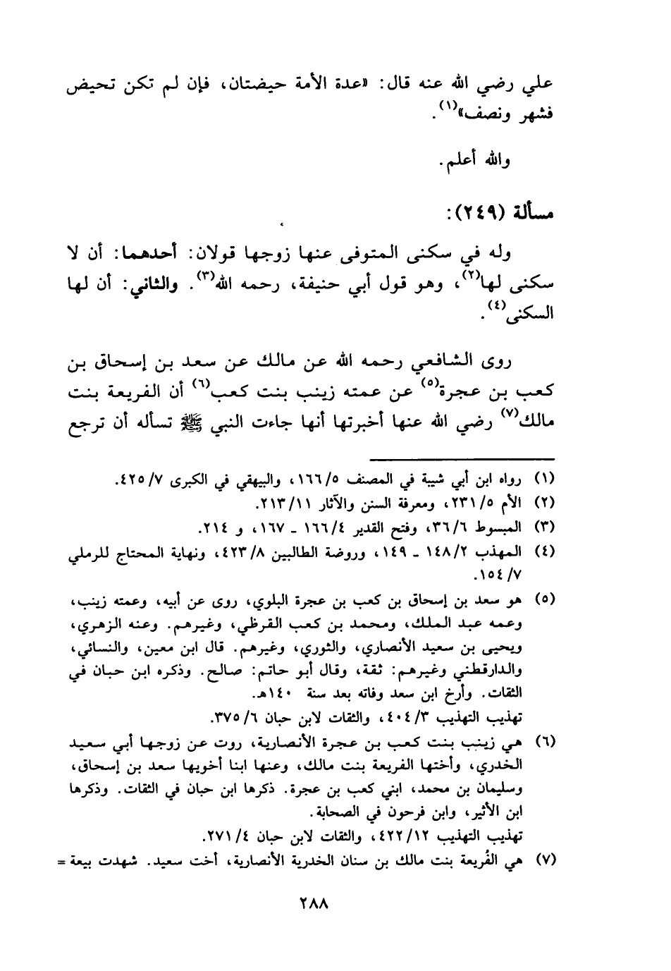 روى الشَّافِعِي رَحمَه الله عَن مَالك عَن سعد بن إِسْحَاق بن كَعْب بن عجْرَة عَن عمته زَيْنَب بنت كَعْب أَن الفريعة بنت مَالك رَضِي الله عَنْهَا أخْبرتهَا أَنَّهَا جَاءَت النَّبِي - صَلَّى اللَّهُ عَلَيْهِ وَسَلَّم َ - تسأله أَن ترجع