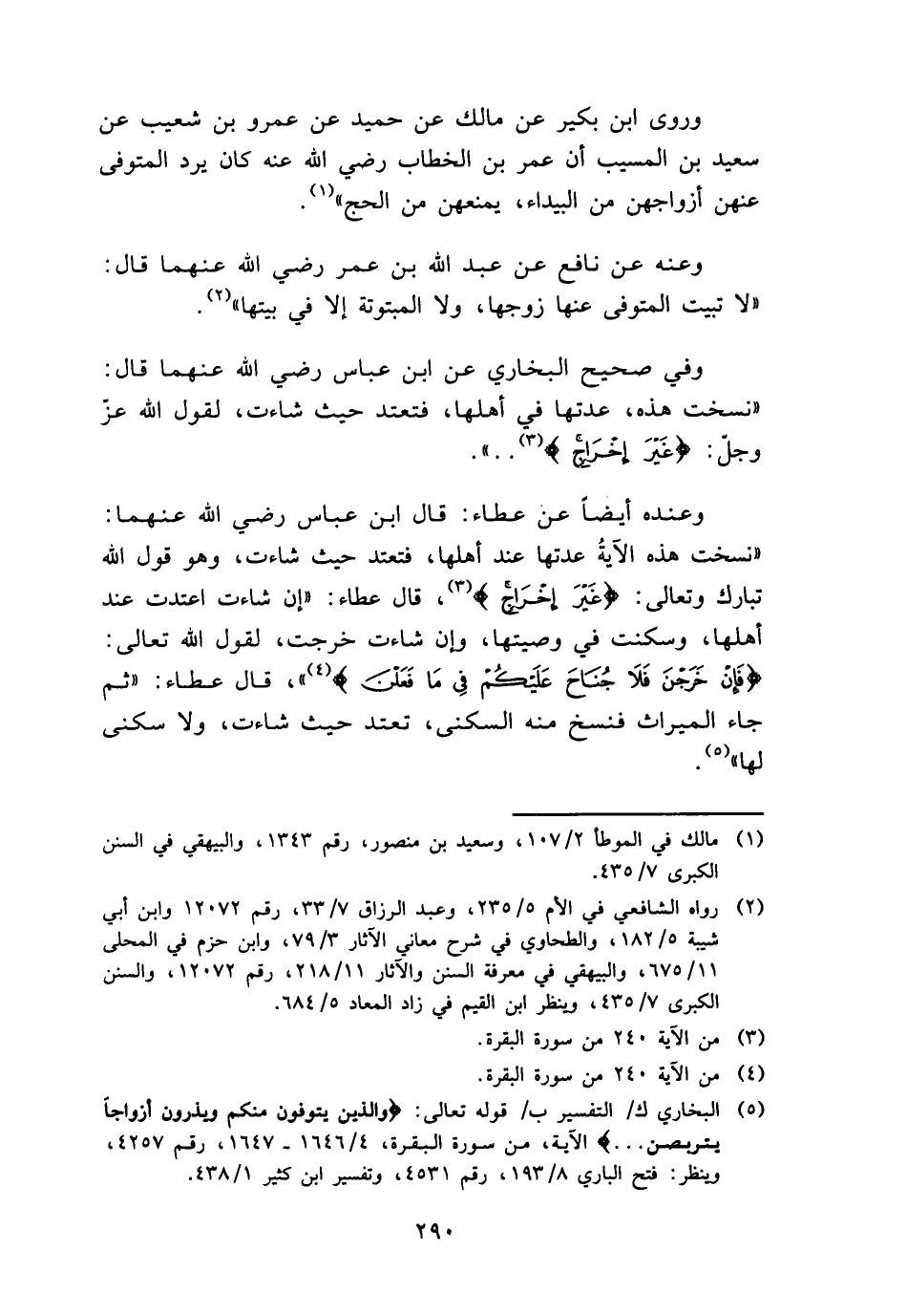 وَفِي صَحِيح البُخَارِيّ عَن ابْن عَبَّاس رَضِي الله عَنْهُمَا قَالَ: " نسخت هَذِه، عدتهَا فِي أَهلهَا، فَتعْتَد حَيْثُ شَاءَت، لقَوْل الله عز وَجل: {غير إِخْرَاج} . . ".