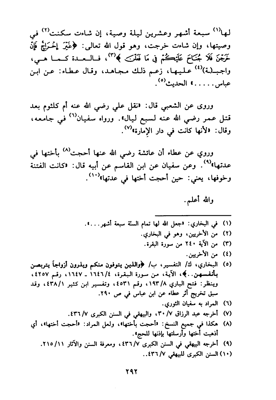 لَهَا سَبْعَة أشهر وَعشْرين لَيْلَة وَصِيَّة، إِن شَاءَت سكنت فِي وصيتها، وَإِن شَاءَت خرجت، وَهُوَ قَول الله تَعَالَى: {غير إِخْرَاج فَإِن خرجن فَلَا جنَاح عَلَيْكُم فِي مَا فعلن} ، فالعدة كَمَا هِيَ، وَاجِب (ة) عَلَيْهَا، زعم ذَلِك مُجَاهِد، وَقَالَ عَطاء: عَن ابْن عَبَّاس ... . . " الحَدِيث.