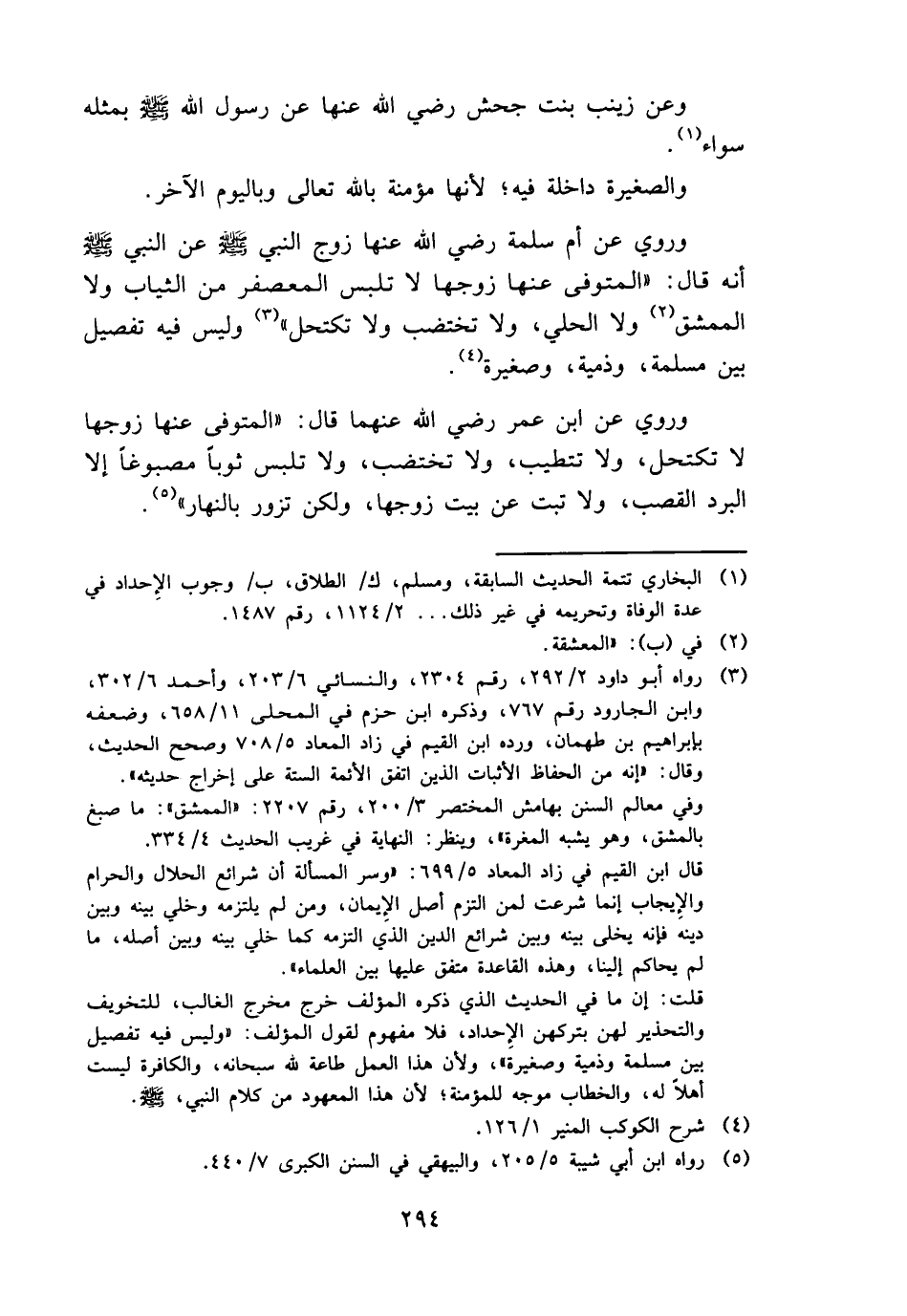 وَرُوِيَ عَن أم سَلمَة رَضِي الله عَنْهَا زوج النَّبِي - صَلَّى اللَّهُ عَلَيْهِ وَسَلَّم َ - عَن النَّبِي - صَلَّى اللَّهُ عَلَيْهِ وَسَلَّم َ - أَنه قَالَ: " الْمُتَوفَّى عَنْهَا زَوجهَا لَا تلبس المعصفر من الثِّيَاب وَلَا الممشق وَلَا الْحلِيّ، وَلَا تختضب وَلَا تكتحل " وَلَيْسَ فِيهِ تَفْصِيل بَين مسلمة، وذمية، وصغيرة.