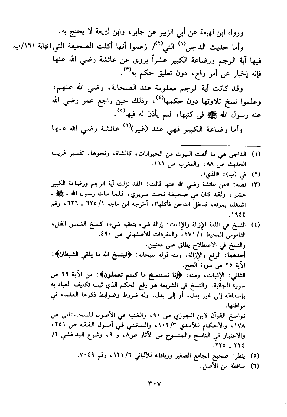 وَأما حَدِيث الدَّاجِن الَّتِي زَعَمُوا أَنَّهَا أكلت الصَّحِيفَة الَّتِي فِيهَا آيَة الرَّجْم ورضاعة الْكَبِير عشرا يرْوى عَن عَائِشَة رَضِي الله عَنْهَا فَإِنَّهُ إِخْبَار عَن أَمر رفع، دون تَعْلِيق حكم بِهِ.
