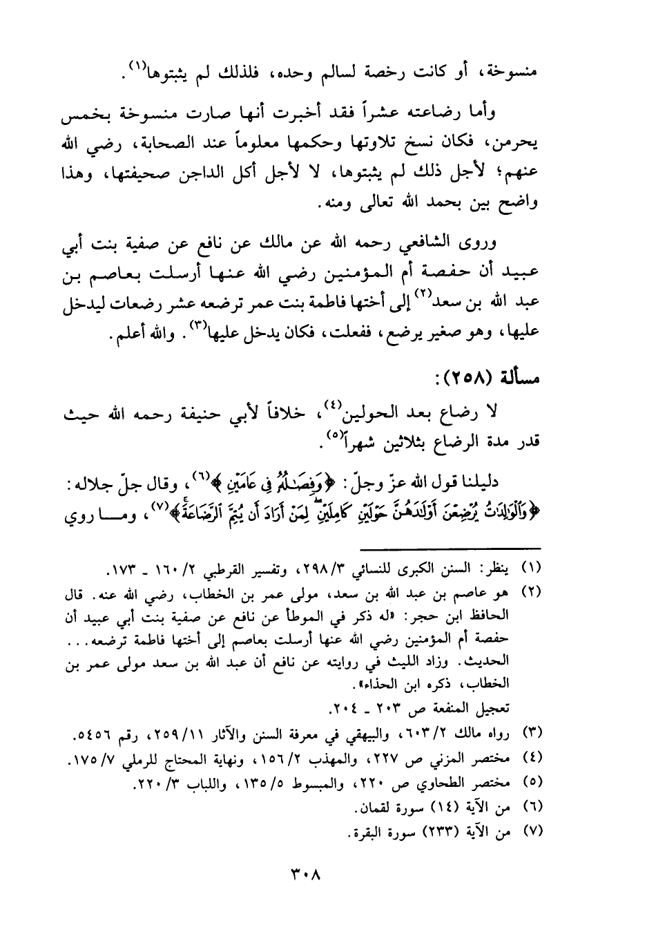وروى الشَّافِعِي رَحمَه الله عَن مَالك عَن نَافِع عَن صَفِيَّة بنت أبي عبيد أَن حَفْصَة أم الْمُؤمنِينَ رَضِي الله عَنْهَا أرْسلت بعاصم بن عبد الله بن سعد إِلَى أُخْتهَا فَاطِمَة بنت عمر ترْضِعه عشر رَضعَات ليدْخل عَلَيْهَا، وَهُوَ صَغِير يرضع، فَفعلت، فَكَانَ يدْخل عَلَيْهَا. وَالله أعلم.