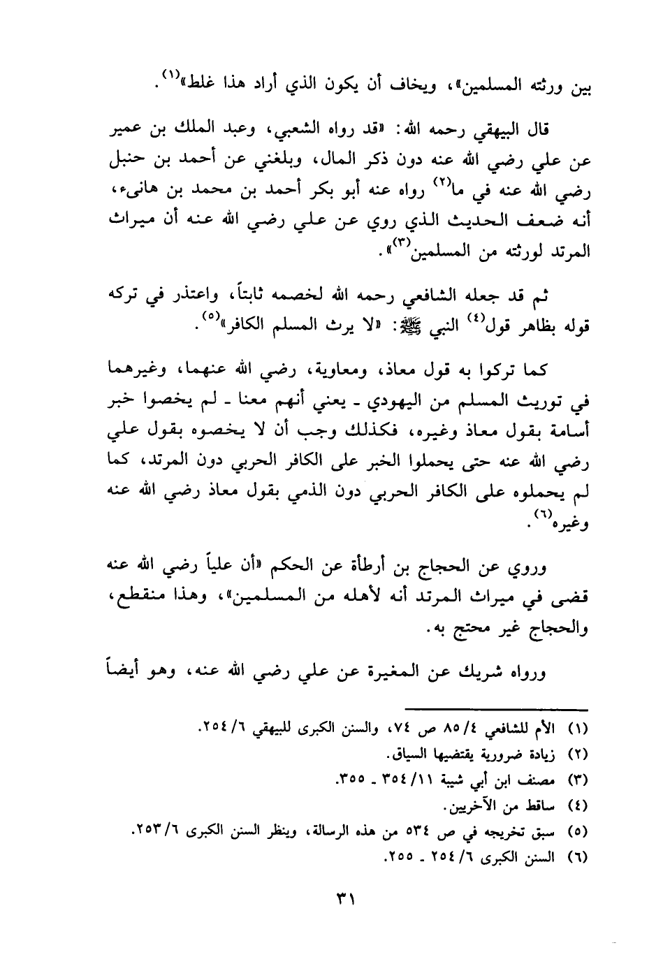 قَالَ الْبَيْهَقِيّ رَحمَه الله: " قد رَوَاهُ الشّعبِيّ، وَعبد الْملك بن عُمَيْر عَن عَليّ رَضِي الله عَنهُ دون ذكر المَال، وَبَلغنِي عَن أَحْمد بن حَنْبَل رَضِي الله عَنهُ فِي مَا رَوَاهُ عَنهُ أَبُو بكر أَحْمد بن مُحَمَّد بن هَانِئ، أَنه ضعف الحَدِيث الَّذِي رُوِيَ عَن عَليّ رَضِي الله عَنهُ أَن مِيرَاث الْمُرْتَد لوَرثَته من الْمُسلمين ".