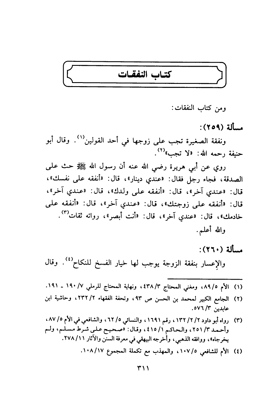 رُوِيَ عَن أبي هُرَيْرَة رَضِي الله عَنهُ أَن رَسُول الله - صَلَّى اللَّهُ عَلَيْهِ وَسَلَّم َ - حث على الصَّدَقَة، فجَاء رجل فَقَالَ: " عِنْدِي دِينَار "، قَالَ: " أنفقهُ على نَفسك "، قَالَ: " عِنْدِي آخر "، قَالَ: " أنفقهُ على ولدك "، قَالَ: " عِنْدِي آخر "، قَالَ: " أنفقهُ على زَوجتك "، قَالَ: " عِنْدِي آخر "، قَالَ: " أنفقهُ على خادمك "، قَالَ: " عِنْدِي آخر "، قَالَ: " أَنْت أبْصر "، رُوَاته ثِقَات.