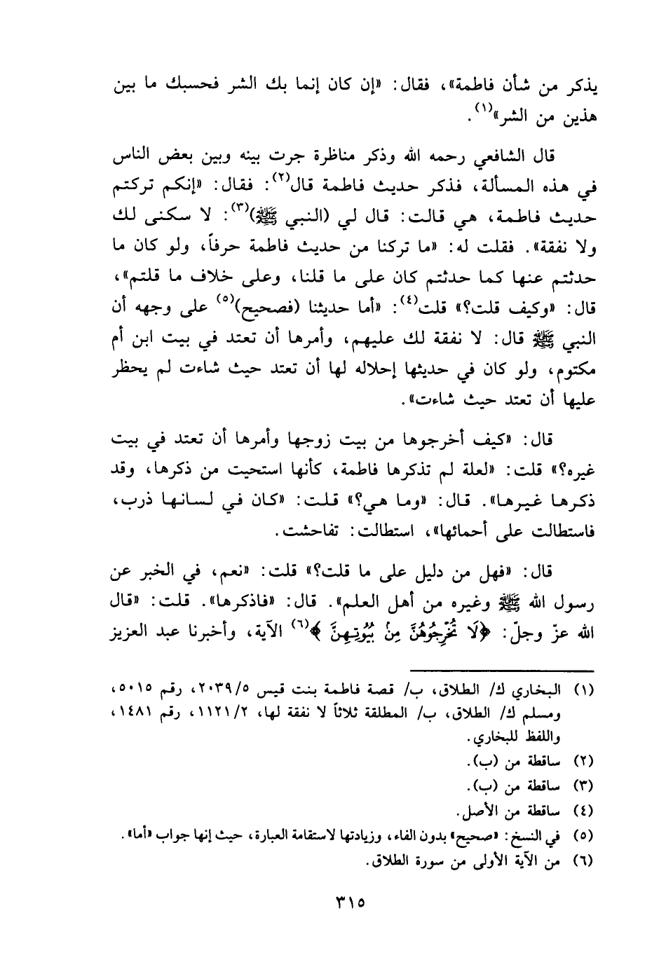 قَالَ الشَّافِعِي رَحمَه الله وَذكر مناظرة جرت بَينه وَبَين بعض النَّاس فِي هَذِه الْمَسْأَلَة، فَذكر حَدِيث فَاطِمَة قَالَ: فَقَالَ: " إِنَّكُم تركْتُم حَدِيث فَاطِمَة، هِيَ قَالَت: قَالَ لي (النَّبِي - صَلَّى اللَّهُ عَلَيْهِ وَسَلَّم َ -) : لَا سُكْنى لَك وَلَا نَفَقَة " , فَقلت لَهُ: " مَا تركنَا من حَدِيث فَاطِمَة حرفا، وَلَو كَانَ مَا حدثتم عَنْهَا كَمَا حدثتم كَانَ على مَا قُلْنَا، وعَلى خلاف مَا قُلْتُمْ "، قَالَ: " وَكَيف قلت؟ " قلت: " أما حديثنا (فَصَحِيح) على وَجهه أَن النَّبِي - صَلَّى اللَّهُ عَلَيْهِ وَسَلَّم َ - قَالَ: لَا نَفَقَة لَك عَلَيْهِم، وأمرها أَن تَعْتَد فِي بَيت ابْن أم مَكْتُوم، وَلَو كَانَ فِي حَدِيثهَا إحلاله لَهَا أَن تَعْتَد حَيْثُ شَاءَت لم يحظر عَلَيْهَا أَن تَعْتَد حَيْثُ شَاءَت ".