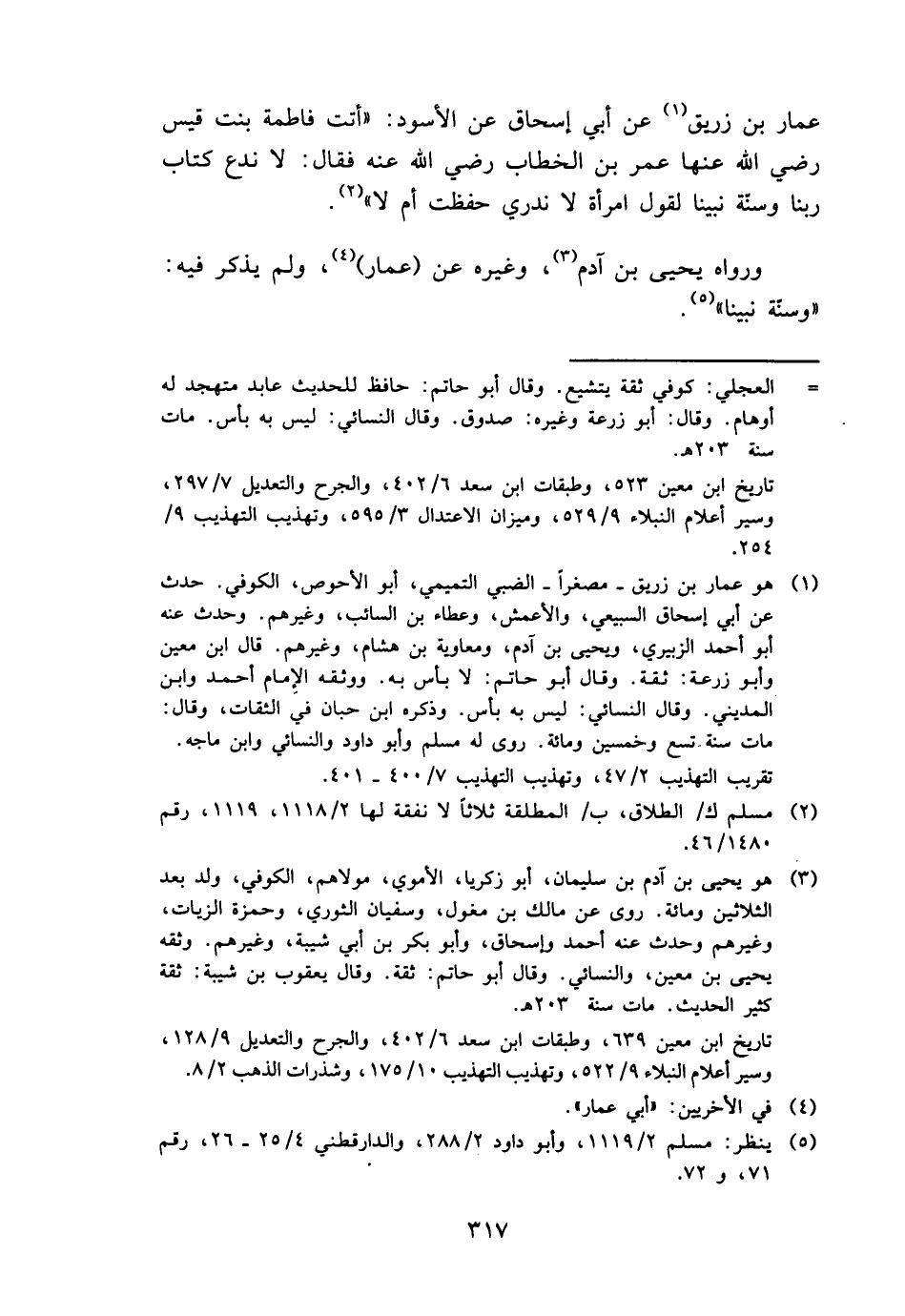 عمار بن زُرَيْق عَن أبي إِسْحَاق عَن الْأسود: " أَتَت فَاطِمَة بنت قيس رَضِي الله عَنْهَا عمر بن الْخطاب رَضِي الله عَنهُ فَقَالَ: لَا نَدع كتاب رَبنَا وَسنة نَبينَا لقَوْل امْرَأَة لَا نَدْرِي حفظت أم لَا ".