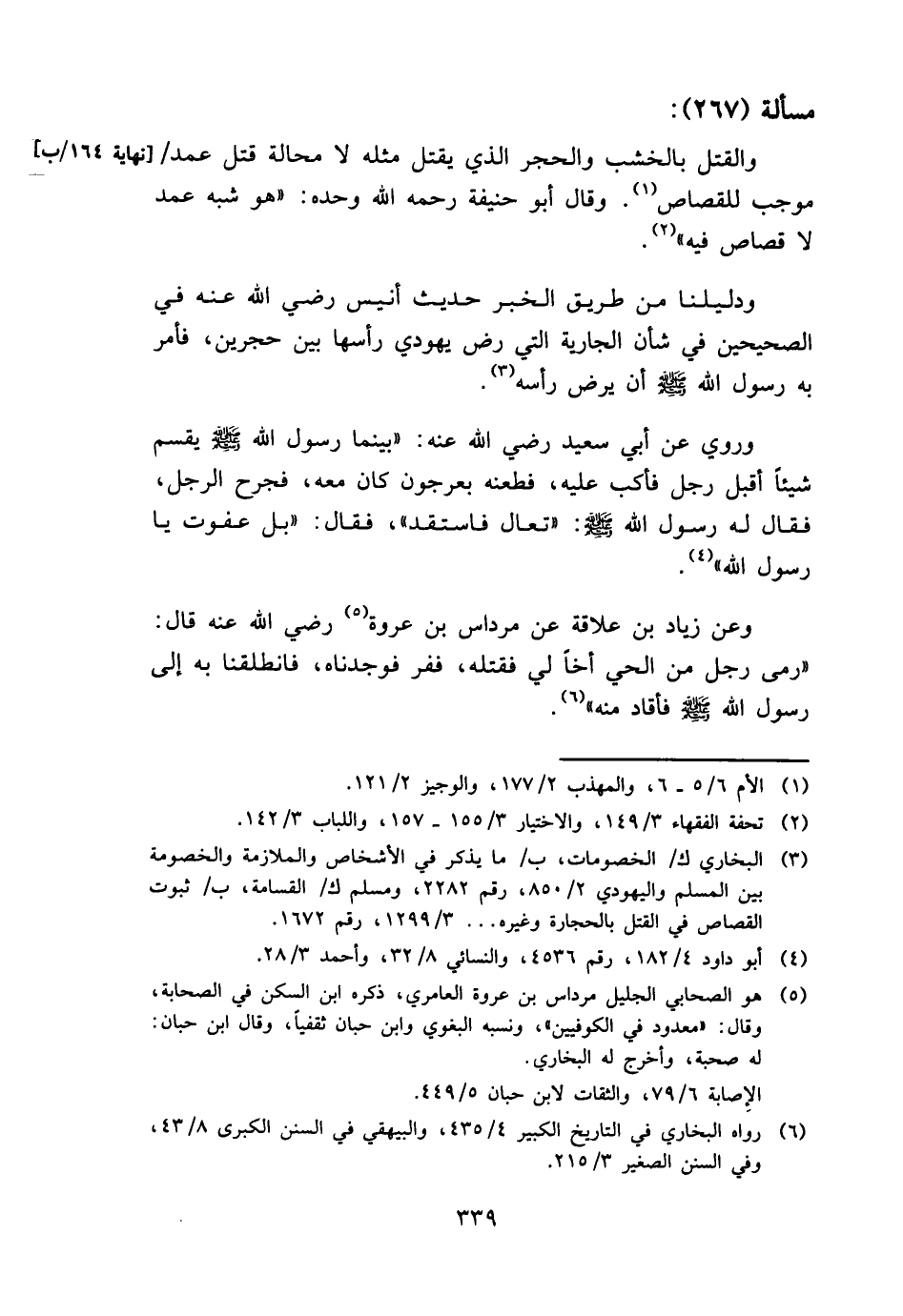 وَعَن زِيَاد بن علاقَة عَن مرداس بن عُرْوَة رَضِي الله عَنهُ قَالَ: " رمى رجل من الْحَيّ أَخا لي فَقتله، ففر فوجدناه، فَانْطَلَقْنَا بِهِ إِلَى رَسُول الله - صَلَّى اللَّهُ عَلَيْهِ وَسَلَّم َ - فأقاد مِنْهُ ".