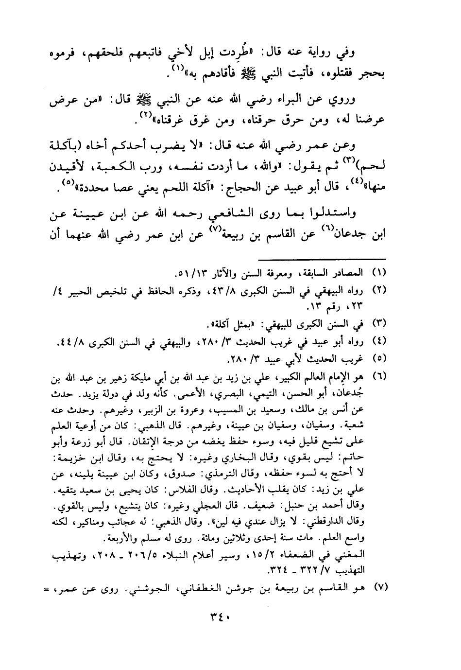 وَعَن عمر رَضِي الله عَنهُ قَالَ: " لَا يضْرب أحدكُم أَخَاهُ (بآكلة لحم) ثمَّ يَقُول: " وَالله، مَا أردْت نَفسه، وَرب الْكَعْبَة، لأقيدن مِنْهَا، قَالَ أَبُو عبيد عَن الْحجَّاج: " آكِلَة اللَّحْم يَعْنِي عَصا محددة ".