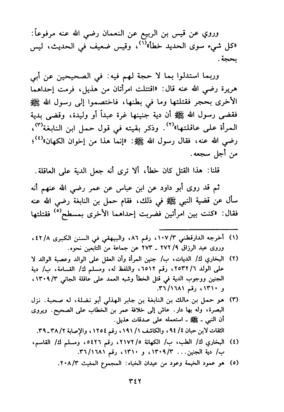 ثمَّ قد روى أَبُو دَاوُد عَن ابْن عَبَّاس عَن عمر رَضِي الله عَنْهُم أَنه سَأَلَ عَن قَضِيَّة النَّبِي - صَلَّى اللَّهُ عَلَيْهِ وَسَلَّم َ - فِي ذَلِك، فَقَامَ حمل بن النَّابِغَة رَضِي الله عَنهُ فَقَالَ: " كنت بَين امْرَأتَيْنِ فَضربت إِحْدَاهمَا الْأُخْرَى بمسطح فقتلتها