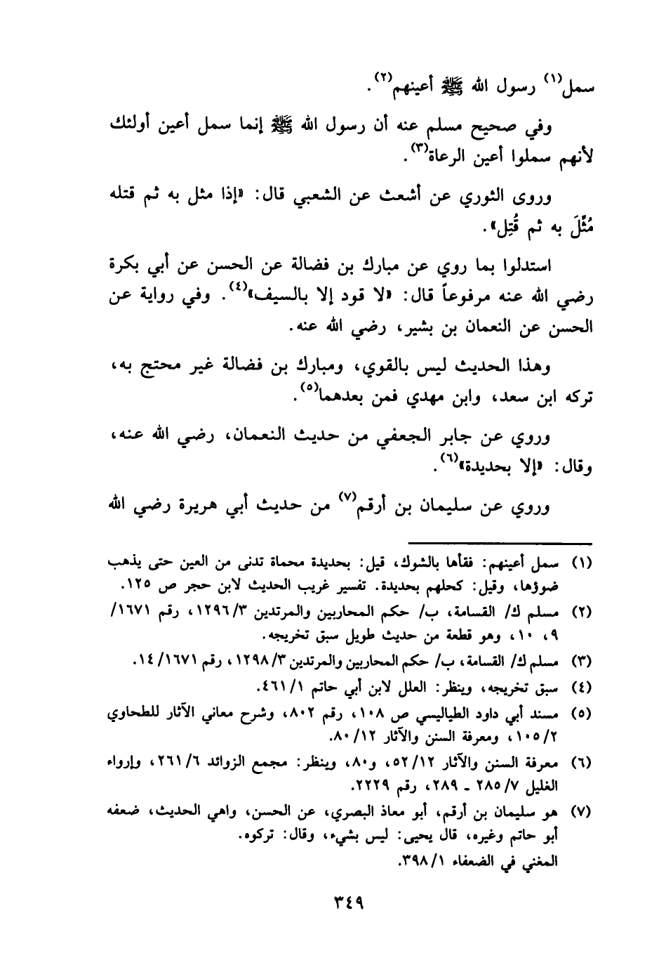 وَفِي صَحِيح مُسلم عَنهُ أَن رَسُول الله - صَلَّى اللَّهُ عَلَيْهِ وَسَلَّم َ - إِنَّمَا سمل أعين أُولَئِكَ لأَنهم سملوا أعين الرُّعَاة.