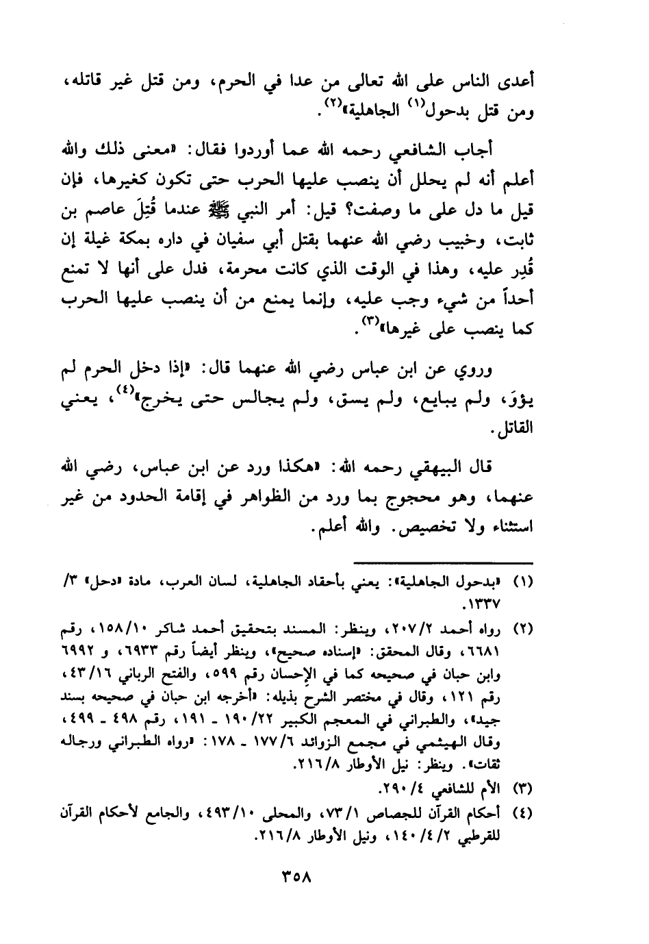 أجَاب الشَّافِعِي رَحمَه الله عَمَّا أوردوا فَقَالَ: " معنى ذَلِك وَالله أعلم أَنه لم يحلل ان ينصب عَلَيْهَا الْحَرْب حَتَّى تكون كَغَيْرِهَا، فَإِن قيل مَا دلّ على مَا وصفت؟ قيل: أَمر النَّبِي - صَلَّى اللَّهُ عَلَيْهِ وَسَلَّم َ - عِنْدَمَا قتل عَاصِم بن ثَابت، وخبيب رَضِي الله عَنْهُمَا بقتل أبي سُفْيَان فِي دَاره بِمَكَّة غيلَة إِن قدر عَلَيْهِ، وَهَذَا فِي الْوَقْت الَّذِي كَانَت مُحرمَة، فَدلَّ على أَنَّهَا لَا تمنع أحدا من شَيْء وَجب عَلَيْهِ، وَإِنَّمَا يمْنَع من أَن ينصب عَلَيْهَا الْحَرْب كَمَا ينصب على غَيرهَا ".