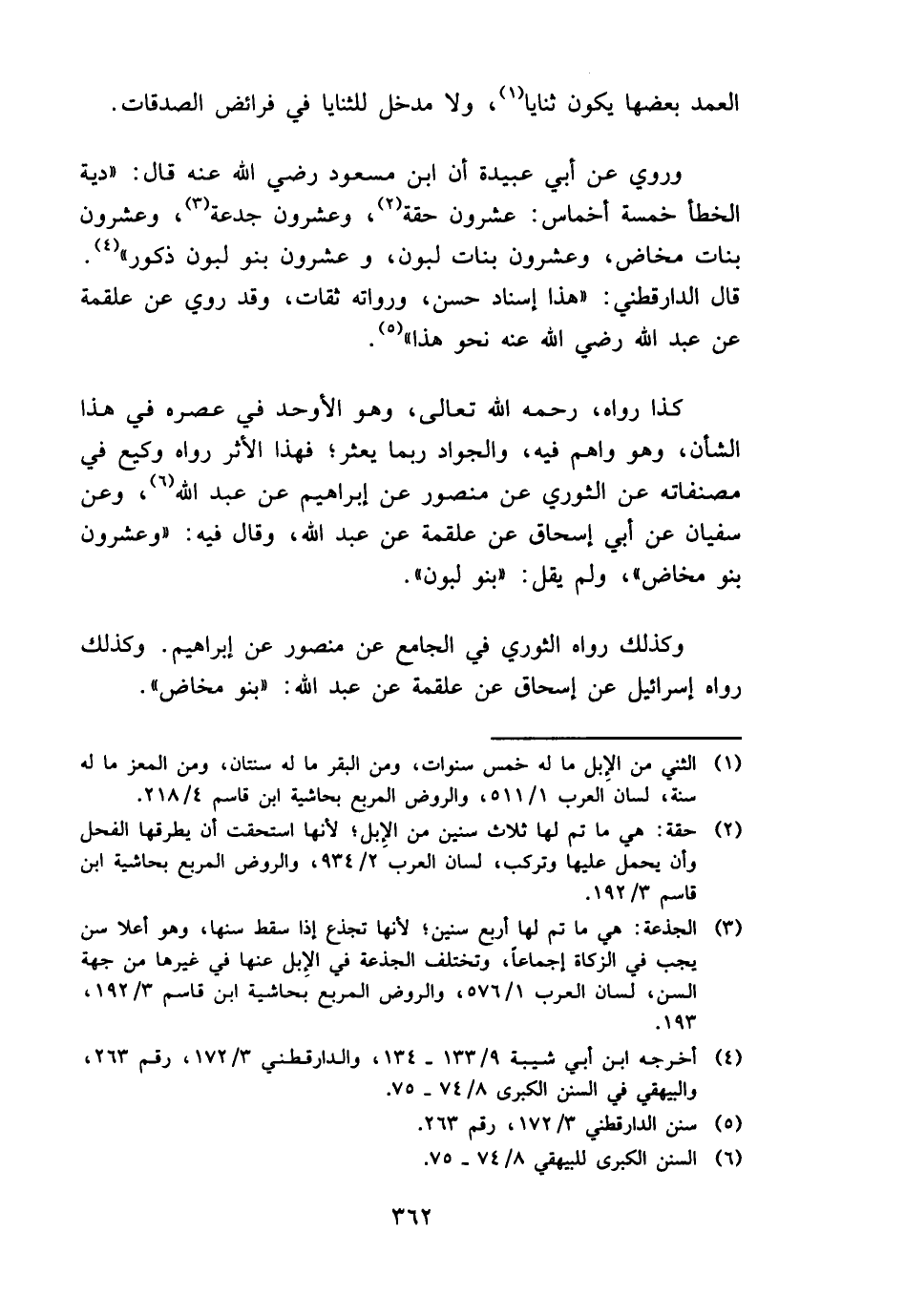 كَذَا رَوَاهُ، رَحمَه الله تَعَالَى، وَهُوَ الأوحد فِي عصره فِي هَذَا الشَّأْن، وَهُوَ واهم فِيهِ، والجواد رُبمَا يعثر؛ فَهَذَا الْأَثر رَوَاهُ وَكِيع فِي مصنفاته عَن الثَّوْريّ عَن مَنْصُور عَن إِبْرَاهِيم عَن عبد الله، وَعَن سُفْيَان عَن أبي إِسْحَاق عَن عَلْقَمَة عَن عبد الله، وَقَالَ فِيهِ: " وَعِشْرُونَ بَنو مَخَاض "، وَلم يقل: " بَنو لبون ".
