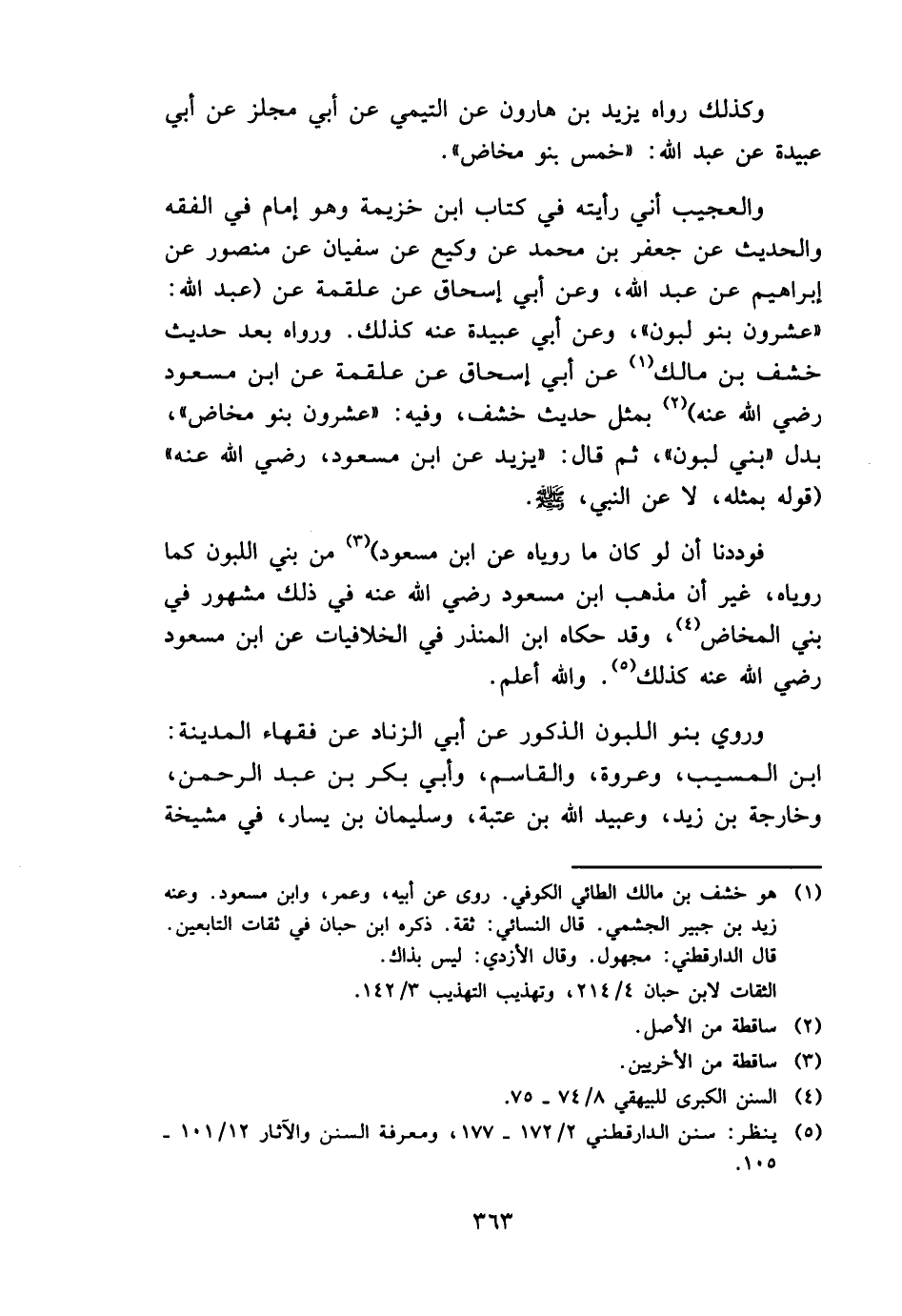 والعجيب أَنِّي رايته فِي كتاب ابْن خُزَيْمَة وَهُوَ إِمَام فِي الْفِقْه والْحَدِيث عَن جَعْفَر بن مُحَمَّد عَن وَكِيع عَن سُفْيَان عَن مَنْصُور عَن إِبْرَاهِيم عَن عبد الله، وَعَن أبي إِسْحَاق عَن عَلْقَمَة عَن (عبد الله: " عشرُون بَنو لبون "، وَعَن أبي عُبَيْدَة عَنهُ كَذَلِك. وَرَوَاهُ بعد حَدِيث خشف بن مَالك عَن أبي إِسْحَاق عَن عَلْقَمَة عَن ابْن مَسْعُود رَضِي الله عَنهُ) بِمثل حَدِيث خشف، وَفِيه: " عشرُون بَنو مَخَاض "، بدل " بني لبون "، ثمَّ قَالَ: " يزِيد عَن ابْن مَسْعُود، رَضِي الله عَنهُ " (قَوْله بِمثلِهِ، لَا عَن النَّبِي، - صَلَّى اللَّهُ عَلَيْهِ وَسَلَّم َ -.