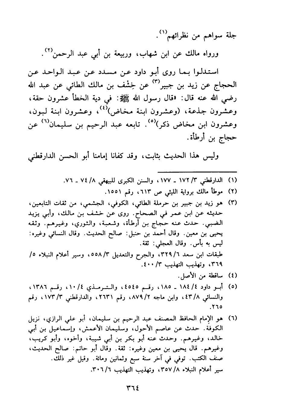 استدلوا بِمَا روى أَبُو دَاوُد عَن مُسَدّد عَن عبد الْوَاحِد عَن الْحجَّاج عَن زيد بن جُبَير عَن خشف بن مَالك الطَّائِي عَن عبد الله رَضِي الله عَنهُ قَالَ: " قَالَ رَسُول الله - صَلَّى اللَّهُ عَلَيْهِ وَسَلَّم َ -: فِي دِيَة الْخَطَأ عشرُون حقة، وَعِشْرُونَ جَذَعَة، (وَعِشْرُونَ ابْنة مَخَاض) ، وَعِشْرُونَ ابْنة لبون، وَعِشْرُونَ ابْن مَخَاض ذكر) . تَابعه عبد الرَّحِيم بن سُلَيْمَان عَن حجاج بن أَرْطَأَة.