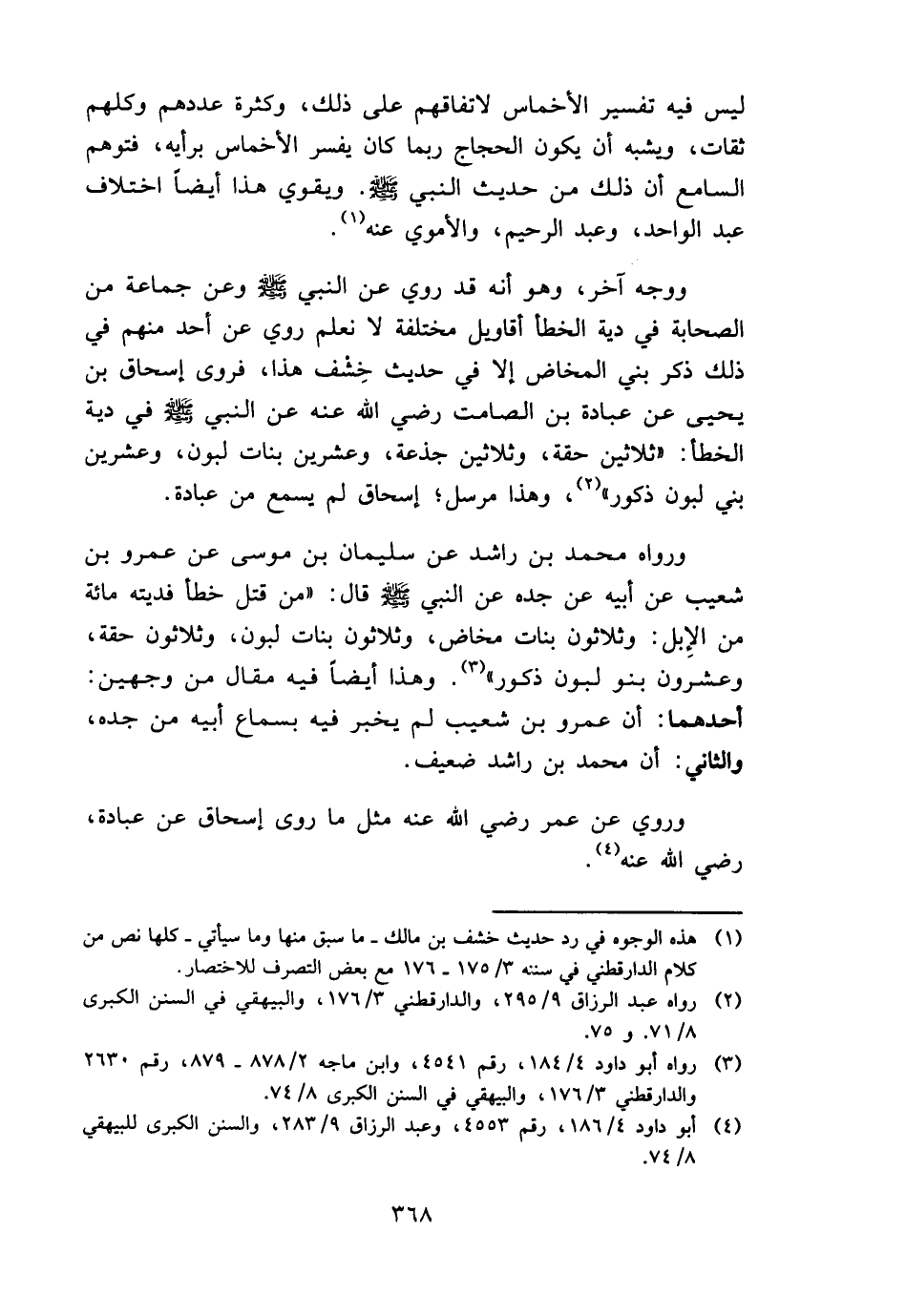 وَوجه آخر، وَهُوَ أَنه قد رُوِيَ عَن النَّبِي - صَلَّى اللَّهُ عَلَيْهِ وَسَلَّم َ - وَعَن جمَاعَة من الصَّحَابَة فِي دِيَة الْخَطَأ أقاويل مُخْتَلفَة لَا نعلم رُوِيَ عَن أحد مِنْهُم فِي ذَلِك ذكر بني الْمَخَاض إِلَّا فِي حَدِيث خشف هَذَا، فروى إِسْحَاق بن يحيى عَن عبَادَة بن الصَّامِت رَضِي الله عَنهُ عَن النَّبِي - صَلَّى اللَّهُ عَلَيْهِ وَسَلَّم َ - فِي دِيَة الْخَطَأ: " ثَلَاثِينَ حقة، وَثَلَاثِينَ جَذَعَة، وَعشْرين بَنَات لبون، وَعشْرين بني لبون ذُكُور "، وَهَذَا مُرْسل؛ إِسْحَاق لم يسمع من عبَادَة.