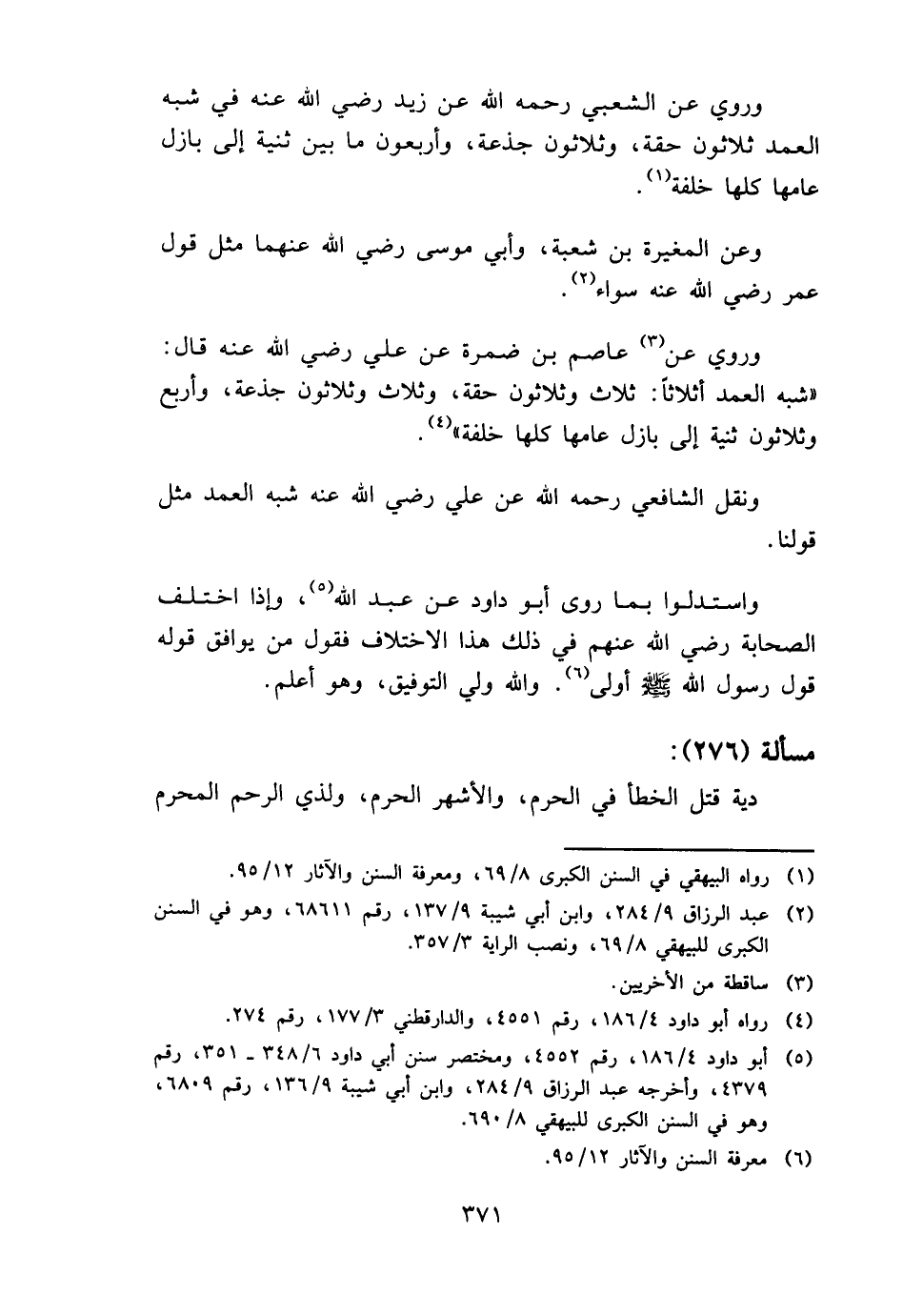 وَرُوِيَ عَن الشّعبِيّ رَحمَه الله عَن زيد رَضِي الله عَنهُ فِي شبه الْعمد ثَلَاثُونَ حقة، وَثَلَاثُونَ جَذَعَة، واربعون مَا بَين ثنية إِلَى بازل عامها كلهَا خلفة.