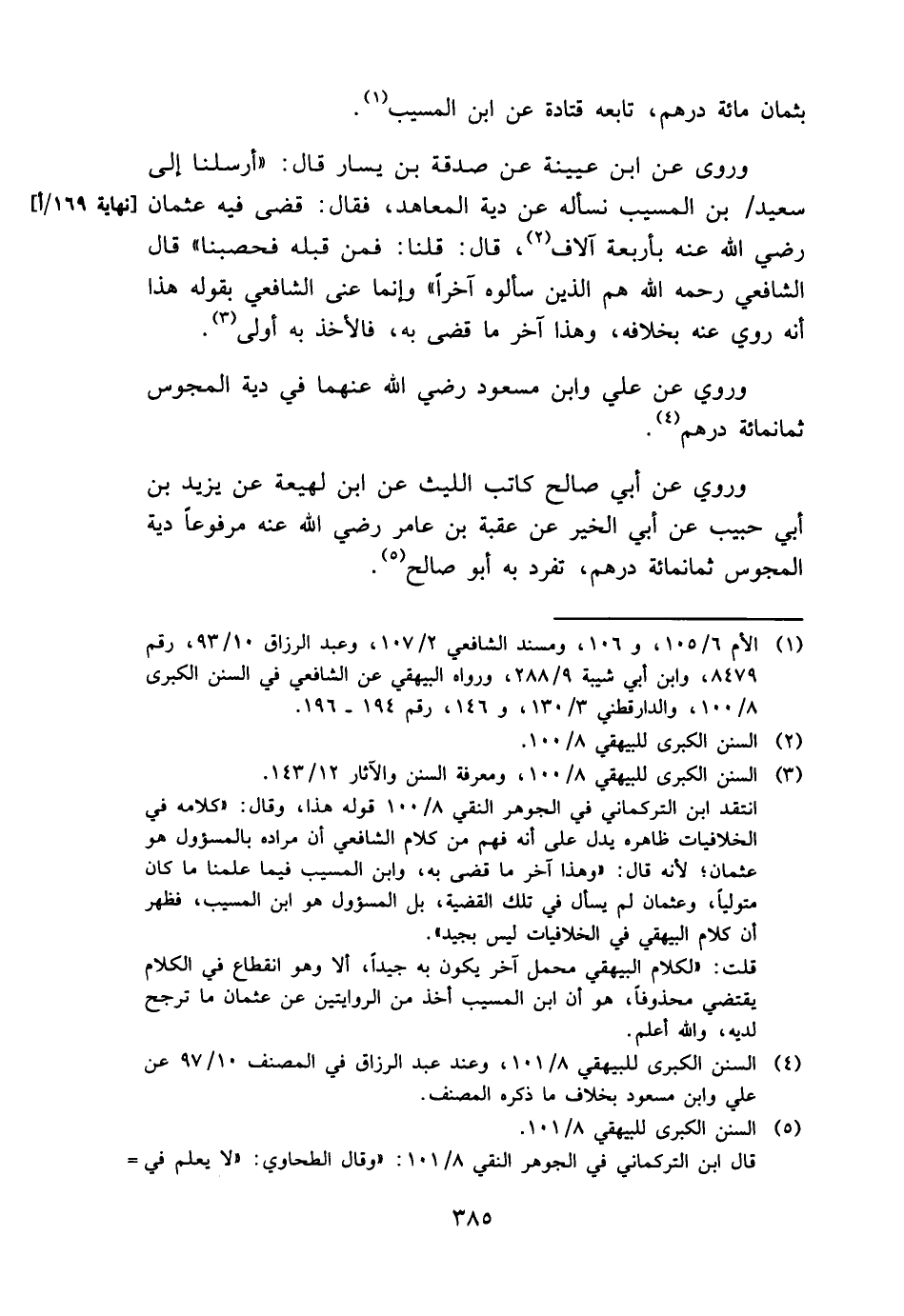 وروى عَن ابْن عُيَيْنَة عَن صَدَقَة بن يسَار قَالَ: " أرسلنَا إِلَى سعيد بن الْمسيب نَسْأَلهُ عَن دِيَة الْمعَاهد، فَقَالَ: قضى فِيهِ عُثْمَان رَضِي الله عَنهُ بأَرْبعَة آلَاف، قَالَ: قُلْنَا: فَمن قبله فحصبنا " قَالَ الشَّافِعِي رَحمَه الله هم الَّذين سَأَلُوهُ آخرا " وَإِنَّمَا عَنى الشَّافِعِي بقوله هَذَا أَنه رُوِيَ عَنهُ بِخِلَافِهِ، وَهَذَا آخر مَا قضى بِهِ، فالأخذ بِهِ أولى.