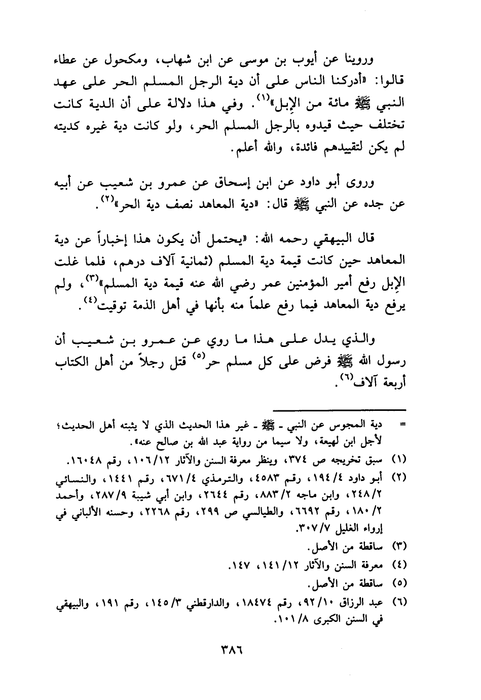 وروينا عَن أَيُّوب بن مُوسَى عَن ابْن شهَاب، وَمَكْحُول عَن عَطاء قَالُوا: " أدركنا النَّاس على أَن دِيَة الرجل الْمُسلم الْحر على عهد النَّبِي - صَلَّى اللَّهُ عَلَيْهِ وَسَلَّم َ - مائَة من الْإِبِل ". وَفِي هَذَا دلَالَة على أَن الدِّيَة كَانَت تخْتَلف حَيْثُ قيدوه بِالرجلِ الْمُسلم الْحر، وَلَو كَانَت دِيَة غَيره كديته لم يكن لتقييدهم فَائِدَة، وَالله أعلم.