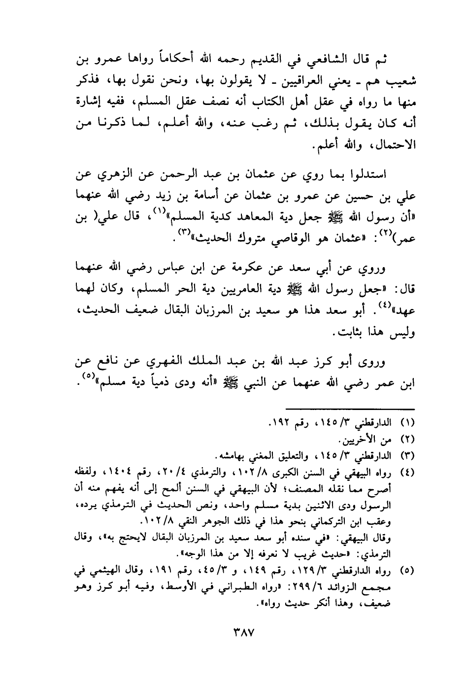ثمَّ قَالَ الشَّافِعِي فِي الْقَدِيم رَحمَه الله أحكاما رَوَاهَا عَمْرو بن شُعَيْب هم - يَعْنِي الْعِرَاقِيّين - لَا يَقُولُونَ بهَا، وَنحن نقُول بهَا، فَذكر مِنْهَا مَا رَوَاهُ فِي عقل أهل الْكتاب أَنه نصف عقل الْمُسلم، فَفِيهِ إِشَارَة أَنه كَانَ يَقُول بذلك، ثمَّ رغب عَنهُ، وَالله أعلم، لما ذكرنَا من الِاحْتِمَال، وَالله أعلم.