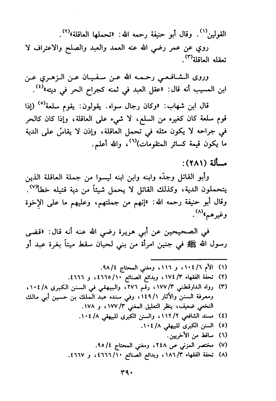 قَالَ ابْن شهَاب: " وَكَانَ رجال سواهُ. يَقُولُونَ: يقوم سلْعَة (إِذا قوم سلْعَة كَانَ كَغَيْرِهِ من السّلع، لَا شَيْء على الْعَاقِلَة، وَإِذا كَانَ كَالْحرِّ فِي جراحه لَا يكون مثله فِي تحمل الْعَاقِلَة، وَإِذن لَا يُقَاس على الدِّيَة مَا يكون قيمَة كَسَائِر المتقومات) ، وَالله أعلم.