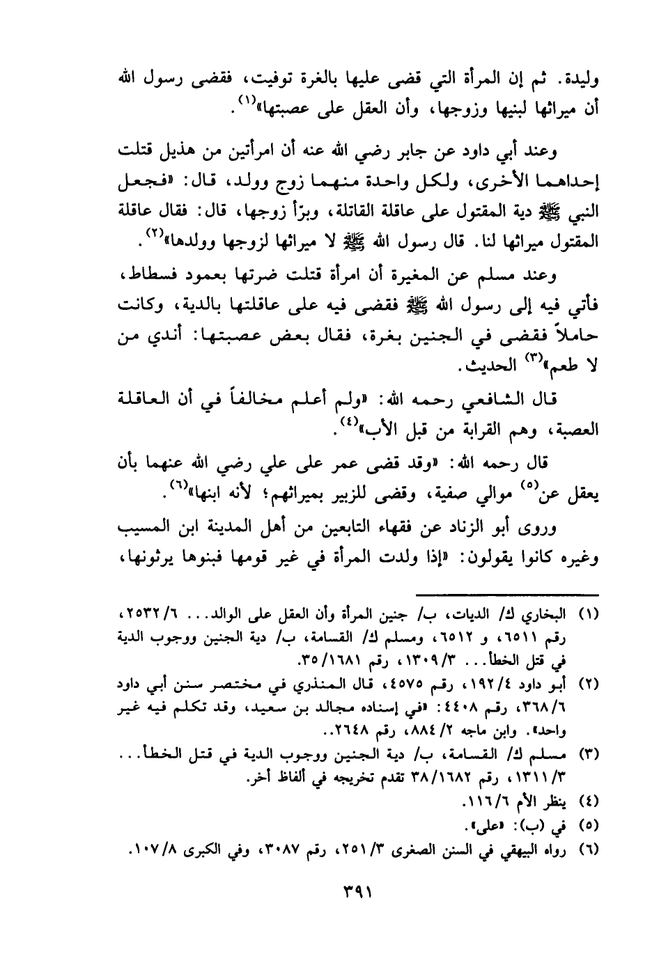 وَعند مُسلم عَن الْمُغيرَة أَن امْرَأَة قتلت ضَرَّتهَا بعمود منسطاطا، فَأتي فِيهِ إِلَى رَسُول الله - صَلَّى اللَّهُ عَلَيْهِ وَسَلَّم َ - فَقضى فِيهِ على عاقلتها بِالدِّيَةِ، وَكَانَت حَامِلا فَقضى فِي الْجَنِين بغرة، فَقَالَ بعض عصبتها: أندي من لَا طعم " الحَدِيث.