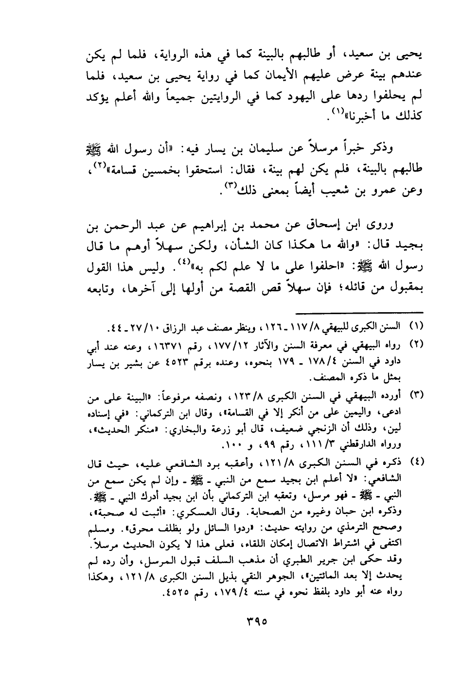 وَذكر خَبرا مُرْسلا عَن سُلَيْمَان بن يسَار فِيهِ: " أَن رَسُول الله - صَلَّى اللَّهُ عَلَيْهِ وَسَلَّم َ - طالبهم بِالْبَيِّنَةِ، فَلم يكن لَهُم بَيِّنَة، فَقَالَ: استحقوا بِخَمْسِينَ قسَامَة "، وَعَن عَمْرو بن شُعَيْب أَيْضا بِمَعْنى ذَلِك.
