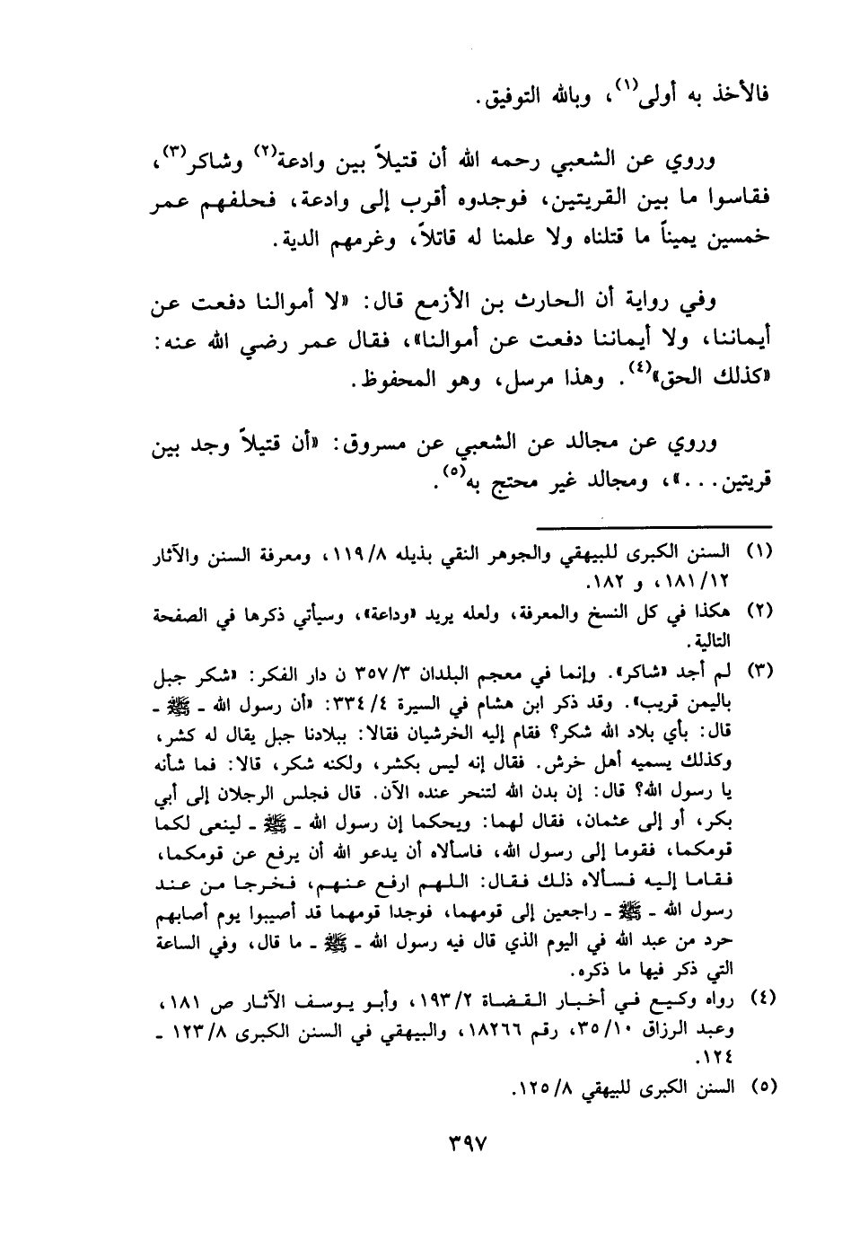 وَرُوِيَ عَن الشّعبِيّ رَحمَه الله أَن قَتِيلا بَين وَادعَة وشاكر، فقاسوا مَا بَين القريتين، فوجدوه أقرب إِلَى وَادعَة، فحلفهم عمر خمسين يَمِينا مَا قَتَلْنَاهُ وَلَا علمنَا لَهُ قَاتلا، وغرمهم الدِّيَة.