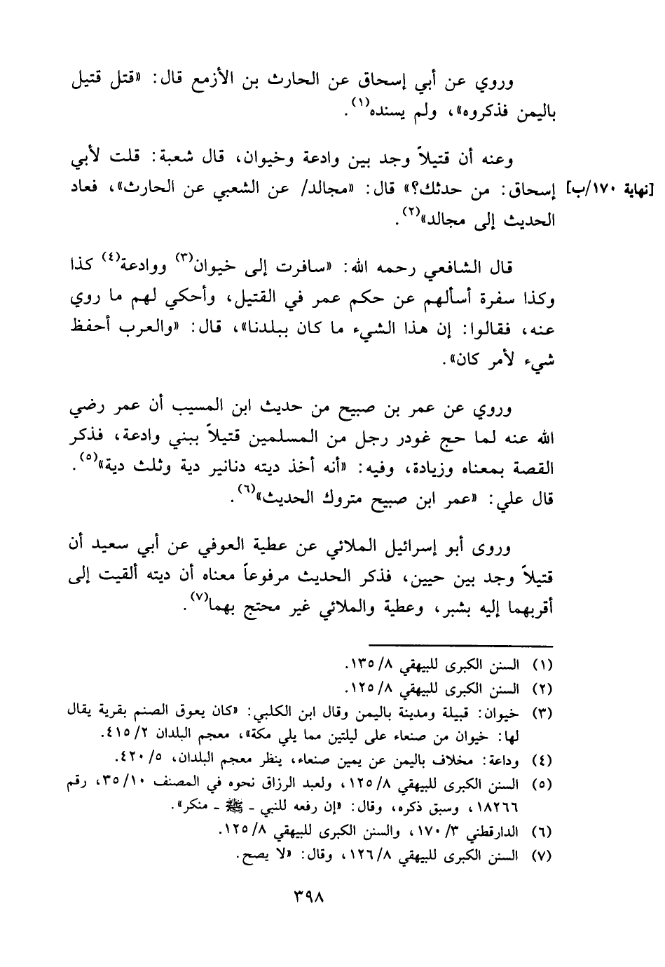 قَالَ الشَّافِعِي رَحمَه الله: " سَافَرت إِلَى خيوان ووادعة كَذَا وَكَذَا سفرة أسألهم عَن حكم عمر فِي الْقَتِيل، وأحكي لَهُم مَا رُوِيَ عَنهُ، فَقَالُوا: إِن هَذَا الشَّيْء مَا كَانَ ببلدنا "، قَالَ: " وَالْعرب أحفظ شَيْء لأمر كَانَ ".