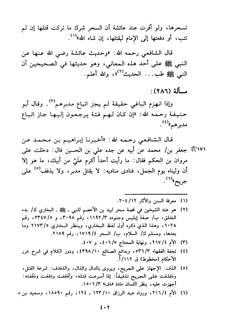 قَالَ الشَّافِعِي رَحمَه الله: " أخبرنَا إِبْرَاهِيم بن مُحَمَّد عَن جَعْفَر بن مُحَمَّد عَن أَبِيه عَن جده عَليّ بن الْحُسَيْن قَالَ: دخلت على مَرْوَان بن الحكم فَقَالَ: مَا رَأَيْت أحدا أكْرم عَليّ من أَبِيك، مَا هُوَ إِلَّا أَن وليناه يَوْم الْجمل، فَنَادَى مناديه: لَا يقتل مُدبر، وَلَا يذفف على جريح ".