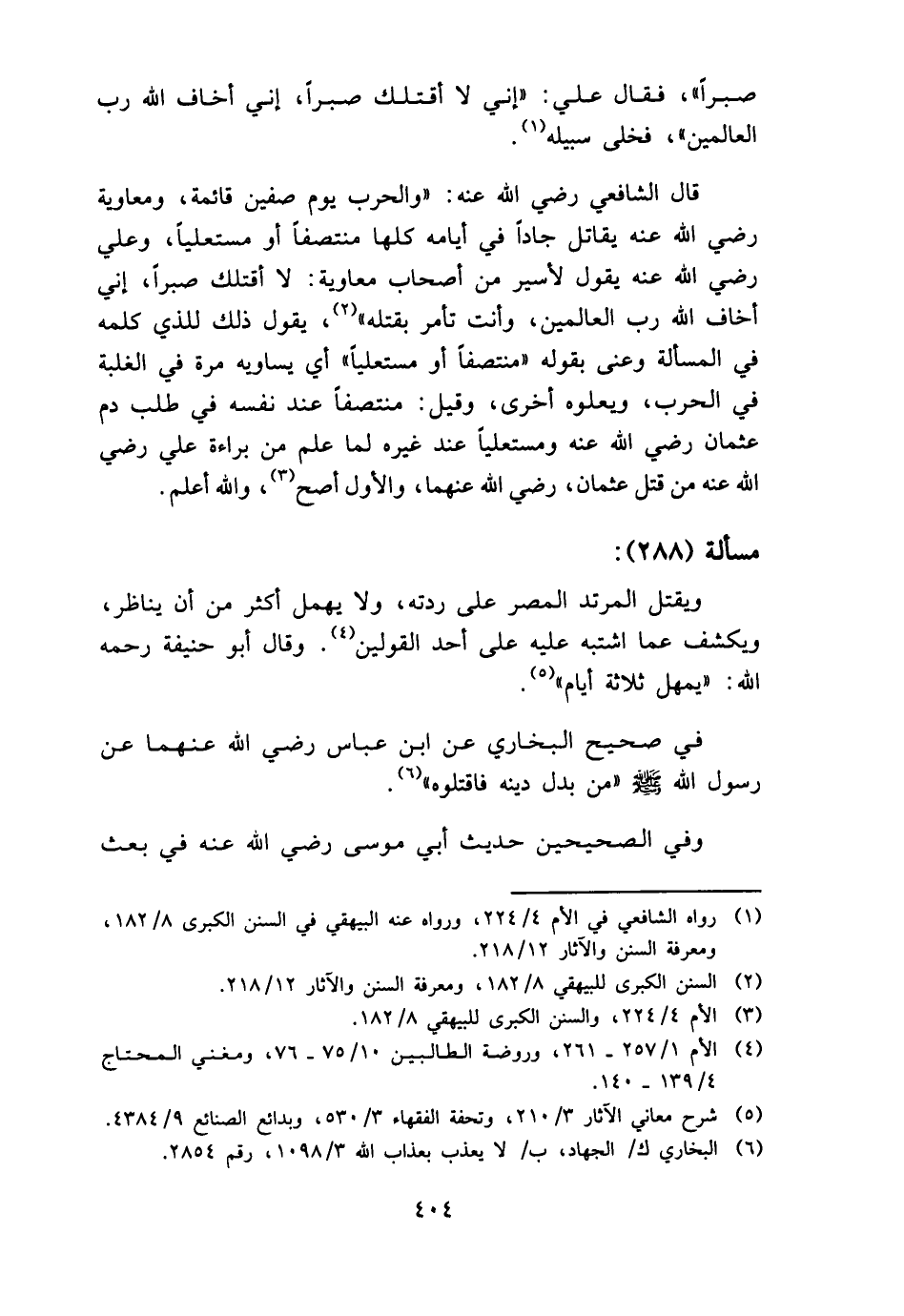 قَالَ الشَّافِعِي رَضِي الله عَنهُ: " وَالْحَرب يَوْم صفّين قَائِمَة، وَمُعَاوِيَة رَضِي الله عَنهُ يُقَاتل جادا فِي أَيَّامه كلهَا منتصفا أَو مستعليا، وَعلي رَضِي الله عَنهُ يَقُول لأسير من أَصْحَاب مُعَاوِيَة: لَا أَقْتلك صبرا، إِنِّي أَخَاف الله رب الْعَالمين، وَأَنت تَأمر بقتْله "، يَقُول ذَلِك للَّذي كَلمه فِي الْمَسْأَلَة وعنى بقوله " منتصفا أَو مستعليا " أَي يُسَاوِيه مرّة فِي الْغَلَبَة فِي الْحَرْب، ويعلوه أُخْرَى، وَقيل: منتصفا عِنْد نَفسه فِي طلب دم عُثْمَان رَضِي الله عَنهُ ومستعليا عِنْد غَيره لما علم من بَرَاءَة عَليّ رَضِي الله عَنهُ من قتل عُثْمَان رَضِي الله عَنْهُمَا، وَالْأول أصح، وَالله أعلم.