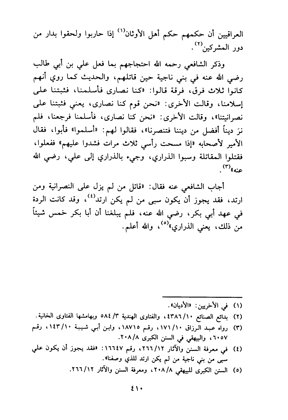 وَذكر الشَّافِعِي رَحمَه الله احتجاجهم بِمَا فعل عَليّ بن أبي طَالب رَضِي الله عَنهُ فِي بني نَاجِية حِين قَاتلهم، والْحَدِيث كَمَا رُوِيَ أَنهم كَانُوا ثَلَاث فرق، فرقة قَالُوا: " كُنَّا نَصَارَى فأسلمنا فثبتنا على إسْلَامنَا، وَقَالَت الْأُخْرَى: " نَحن قوم كُنَّا نَصَارَى، يَعْنِي فثبتنا على نصرانيتنا "، وَقَالَت الْأُخْرَى: " نَحن كُنَّا نَصَارَى، فأسلمنا فرجعنا، فَلم نر دينا أفضل من ديننَا فتنصرنا "، فَقَالُوا لَهُم: " أَسْلمُوا " فَأَبَوا، فَقَالَ الْأَمِير لأَصْحَابه " إِذا مسحت رَأْسِي ثَلَاث مَرَّات فشدوا عَلَيْهِم " فَفَعَلُوا، فَقتلُوا الْمُقَاتلَة وَسبوا الذَّرَارِي، وَجِيء بِالذَّرَارِيِّ إِلَى عَليّ، رَضِي الله عَنهُ ".