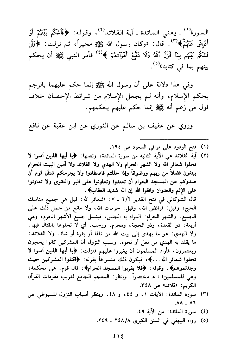 السُّورَة - يَعْنِي الْمَائِدَة - آيَة القلائد، وَقَوله: {فاحكم بَينهم أَو أعرض عَنْهُم} . قَالَ: " وَكَانَ رَسُول الله - صَلَّى اللَّهُ عَلَيْهِ وَسَلَّم َ - مُخَيّرا، ثمَّ نزلت: {وَأَن احكم بَينهم بِمَا أنزل الله وَلَا تتبع أهواءهم} فَأمر النَّبِي - صَلَّى اللَّهُ عَلَيْهِ وَسَلَّم َ - أَن يحكم بَينهم بِمَا فِي كتَابنَا ".