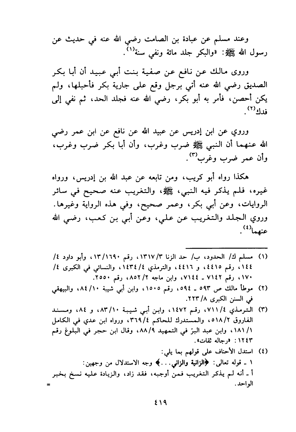 وَعند مُسلم عَن عبَادَة بن الصَّامِت رَضِي الله عَنهُ فِي حَدِيث عَن رَسُول الله - صَلَّى اللَّهُ عَلَيْهِ وَسَلَّم َ -: " وَالْبكْر جلد مائَة وَنفي سنة.