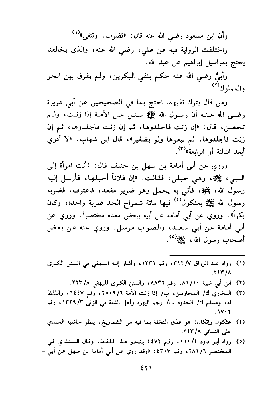 وَرُوِيَ عَن أبي أُمَامَة بن سهل بن حنيف قَالَ: " أَتَت امْرَأَة إِلَى النَّبِي، - صَلَّى اللَّهُ عَلَيْهِ وَسَلَّم َ -، وَهِي حُبْلَى، فَقَالَت: " إِن فلَانا أحبلها، فَأرْسل إِلَيْهِ رَسُول الله، - صَلَّى اللَّهُ عَلَيْهِ وَسَلَّم َ -، فَأتي بِهِ يحمل وَهُوَ ضَرِير مقْعد، فاعترف، فَضَربهُ رَسُول الله - صَلَّى اللَّهُ عَلَيْهِ وَسَلَّم َ - بعثكول فِيهَا مائَة شِمْرَاخ الْحَد ضَرْبَة وَاحِدَة، وَكَانَ بكرا ". وَرُوِيَ عَن أبي أُمَامَة عَن أَبِيه بِبَعْض مَعْنَاهُ مُخْتَصرا. وَرُوِيَ عَن أبي أُمَامَة عَن أبي سعيد، وَالصَّوَاب مُرْسل. وَرُوِيَ عَنهُ عَن بعض أَصْحَاب رَسُول الله، - صَلَّى اللَّهُ عَلَيْهِ وَسَلَّم َ -.