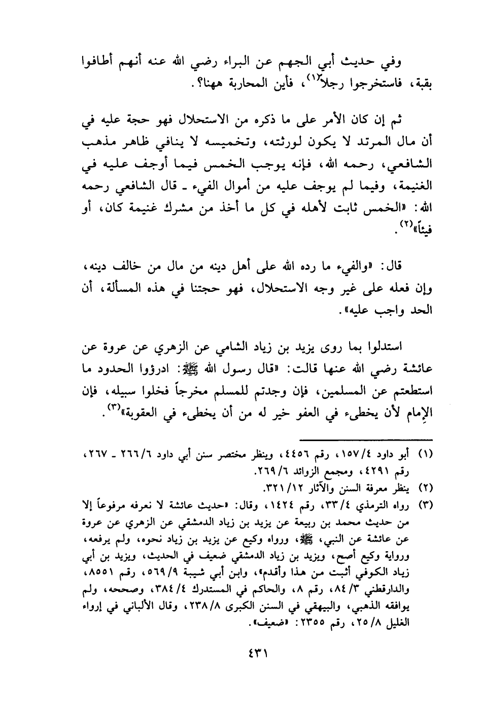 ثمَّ إِن كَانَ الْأَمر على مَا ذكره من الاستحلال فَهُوَ حجَّة عَلَيْهِ فِي أَن مَال الْمُرْتَد لَا يكون لوَرثَته، وتخميسه لَا يُنَافِي ظَاهر مَذْهَب الشَّافِعِي، رَحمَه الله، فَإِنَّهُ يُوجب الْخمس فِيمَا أوجف عَلَيْهِ فِي الْغَنِيمَة، وَفِيمَا لم يوجف عَلَيْهِ من أَمْوَال الْفَيْء - قَالَ الشَّافِعِي رَحمَه الله: " الْخمس ثَابت لأَهله فِي كل مَا أَخذ من مُشْرك غنيمَة كَانَ، أَو فَيْئا ".