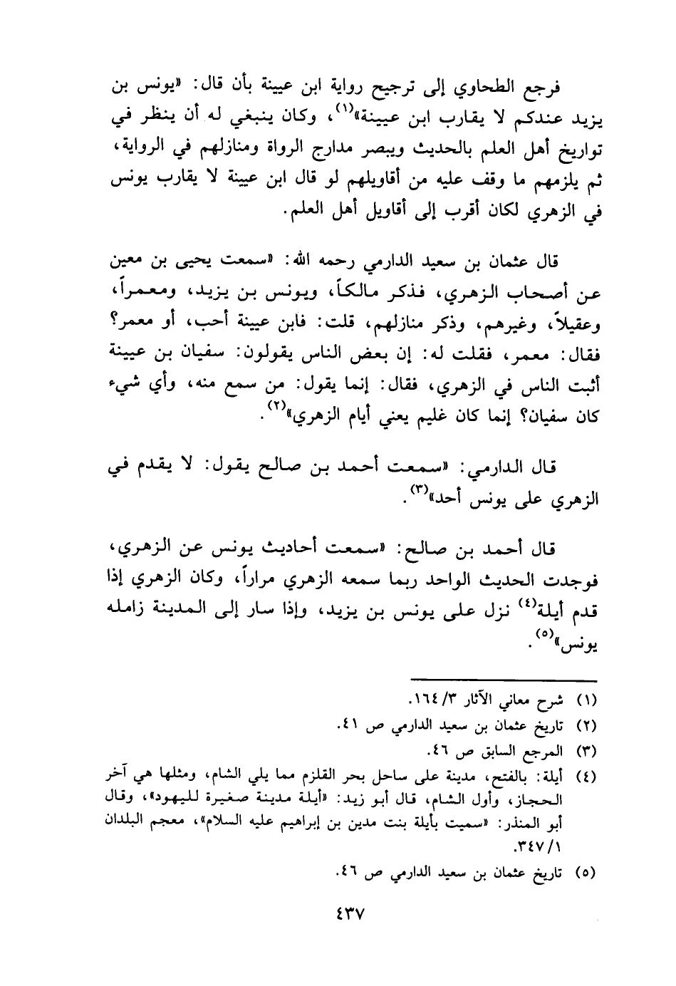 فَرجع الطَّحَاوِيّ إِلَى تَرْجِيح رِوَايَة ابْن عُيَيْنَة بِأَن قَالَ: " يُونُس بن يزِيد عنْدكُمْ لَا يُقَارب ابْن عُيَيْنَة "، وَكَانَ يَنْبَغِي لَهُ أَن ينظر فِي تواريخ أهل الْعلم بِالْحَدِيثِ ويبصر مدارج الروَاة ومنازلهم فِي الرِّوَايَة، ثمَّ يلْزمهُم مَا وقف عَلَيْهِ من أقاويلهم لَو قَالَ ابْن عُيَيْنَة لَا يُقَارب يُونُس فِي الزُّهْرِيّ لَكَانَ أقرب إِلَى أقاويل أهل الْعلم.