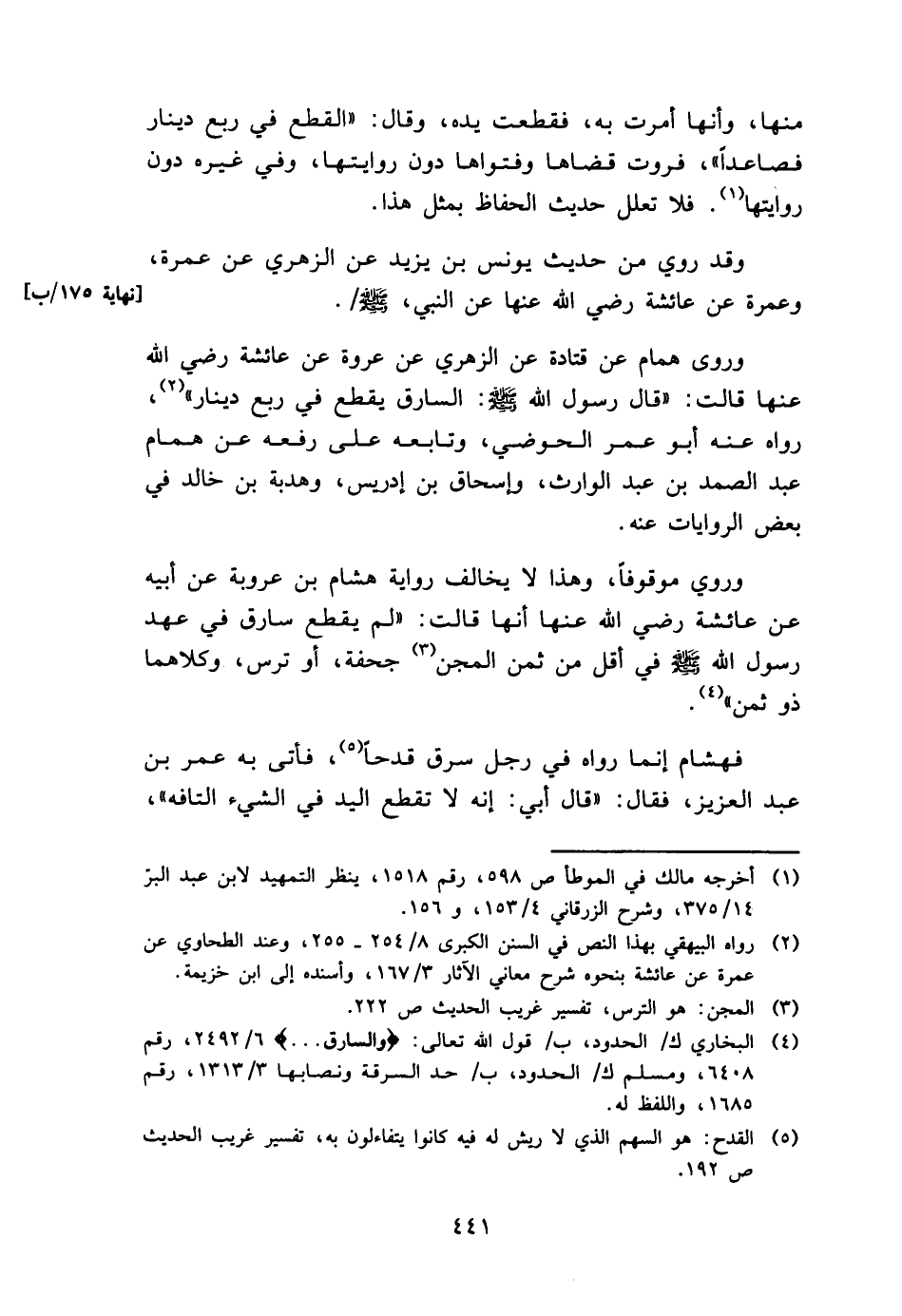 وَرُوِيَ مَوْقُوفا، وَهَذَا لَا يُخَالف رِوَايَة هشان بن عرُوبَة عَن أَبِيه عَن عَائِشَة رَضِي الله عَنْهَا أَنَّهَا قَالَت: " لم يقطع سَارِق فِي عهد رَسُول الله - صَلَّى اللَّهُ عَلَيْهِ وَسَلَّم َ - فِي أقل من ثمن الْمِجَن جحفة، أَو ترس، وَكِلَاهُمَا ذُو ثمن ".