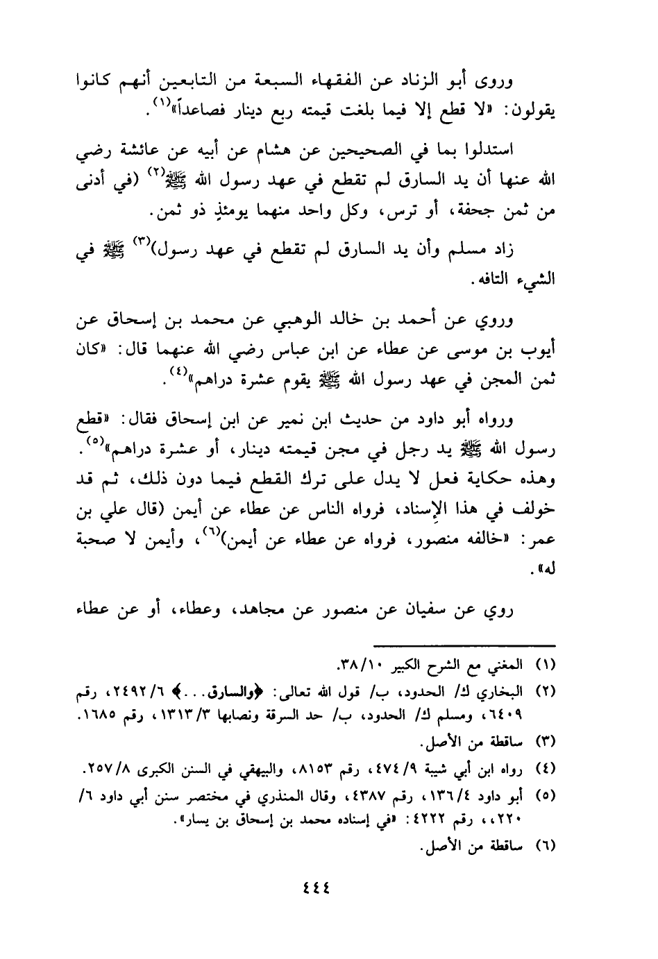 وروى أَبُو الزِّنَاد عَن الْفُقَهَاء السَّبْعَة من التَّابِعين أَنهم كَانُوا يَقُولُونَ: " لَا قطع إِلَّا فِيمَا بلغت قِيمَته ربع دِينَار فَصَاعِدا ".