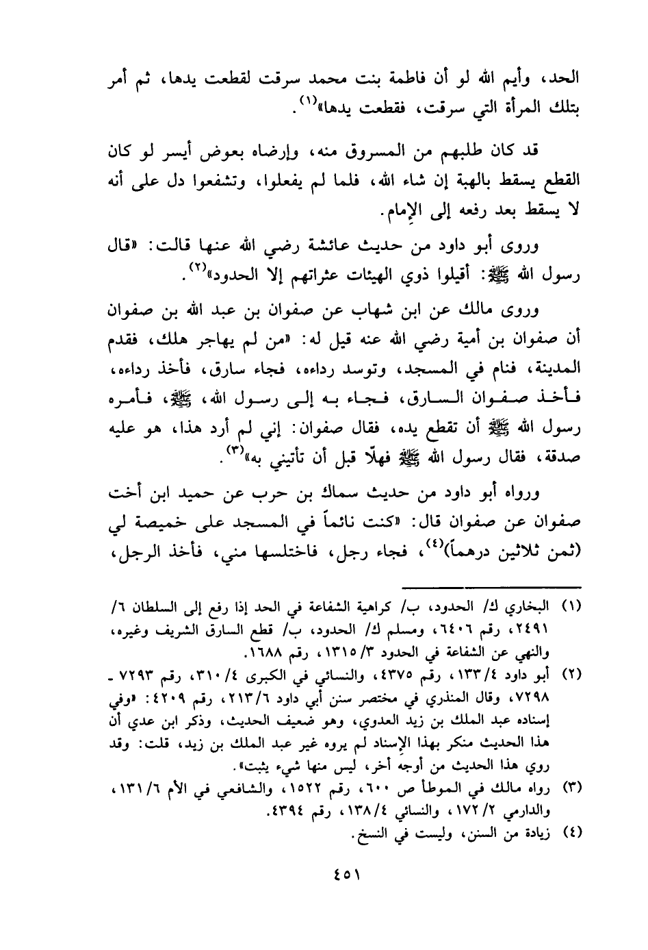 وروى مَالك عَن ابْن شهَاب عَن صَفْوَان بن عبد الله بن صَفْوَان أَن صَفْوَان بن أُميَّة رَضِي الله عَنهُ قيل لَهُ: " من لم يُهَاجر هلك، فَقدم الْمَدِينَة، فَنَامَ فِي الْمَسْجِد، وتوسد رِدَاءَهُ، فجَاء سَارِق، فَأخذ رِدَاءَهُ، فَأخذ صَفْوَان السَّارِق، فجَاء بِهِ إِلَى رَسُول الله، - صَلَّى اللَّهُ عَلَيْهِ وَسَلَّم َ -، فَأمره رَسُول الله - صَلَّى اللَّهُ عَلَيْهِ وَسَلَّم َ - أَن تقطع يَده، فَقَالَ صَفْوَان: إِنِّي لم أرد هَذَا، هُوَ عَلَيْهِ صَدَقَة، فَقَالَ رَسُول الله - صَلَّى اللَّهُ عَلَيْهِ وَسَلَّم َ - فَهَلا قبل أَن تَأتِينِي بِهِ ".