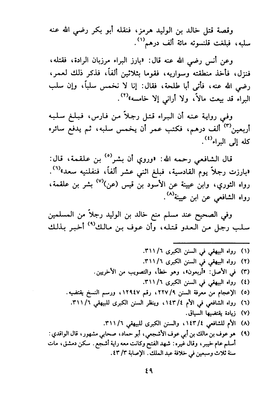 وَعَن أنس رَضِي الله عَنهُ قَالَ: " بارز الْبَراء مرزبان الرادة، فَقتله، فَنزل، فَأخذ منطقته وسواريه، فقوما بِثَلَاثِينَ ألفا، فَذكر ذَلِك لعمر، رَضِي الله عَنهُ، فَأتي أَبَا طَلْحَة، فَقَالَ: إِنَّا لَا نُخَمِّسُ سلبا، وَإِن سلب الْبَراء قد بِيعَتْ مَالا، وَلَا أَرَانِي إِلَّا خَامِسَة ".