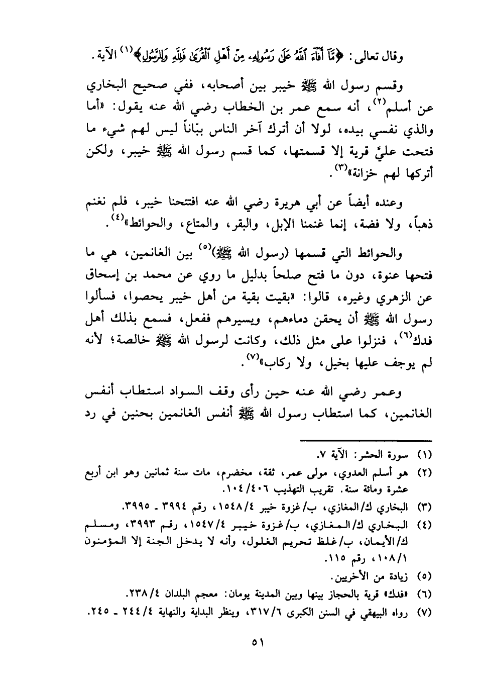 وَقسم رَسُول الله - صَلَّى اللَّهُ عَلَيْهِ وَسَلَّم َ - خَيْبَر بَين أَصْحَابه، فَفِي صَحِيح البُخَارِيّ عَن أسلم، أَنه سمع عمر بن الْخطاب رَضِي الله عَنهُ يَقُول: " أما وَالَّذِي نَفسِي بِيَدِهِ، لَوْلَا أَن أترك آخر النَّاس ببانا لَيْسَ لَهُم شَيْء مَا فتحت عَليّ قَرْيَة إِلَّا قسمتهَا، كَمَا قسم رَسُول الله - صَلَّى اللَّهُ عَلَيْهِ وَسَلَّم َ - خَيْبَر، وَلَكِن أتركها لَهُم خزانَة.