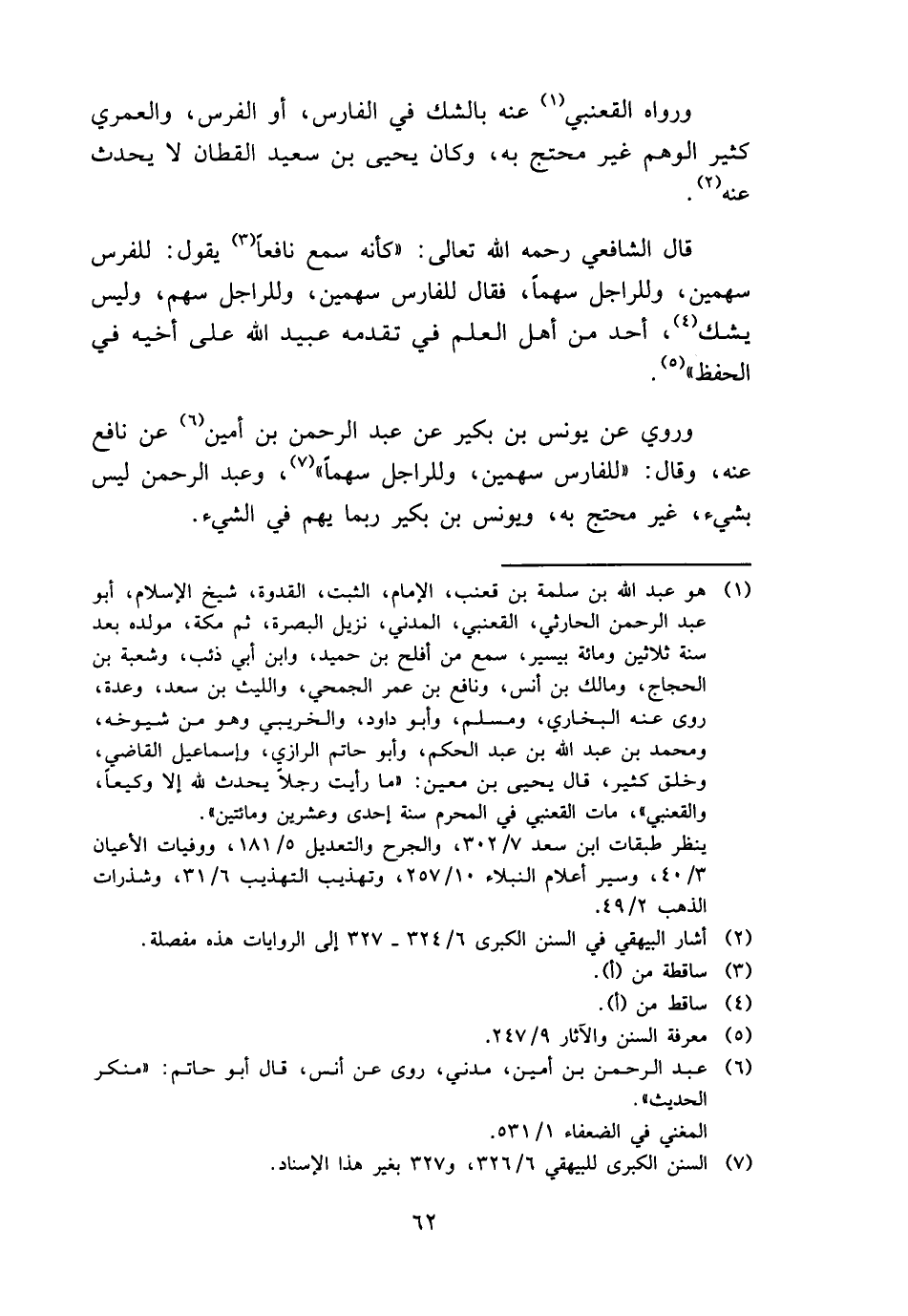 قَالَ الشَّافِعِي رَحمَه الله تَعَالَى: " كَأَنَّهُ سمع نَافِعًا يَقُول: للْفرس سَهْمَيْنِ، وللراجل سَهْما، فَقَالَ للفارس سَهْمَيْنِ، وللراجل سهم، وَلَيْسَ يشك، أحد من أهل الْعلم فِي تقدمه عبيد الله على أَخِيه فِي الْحِفْظ ".