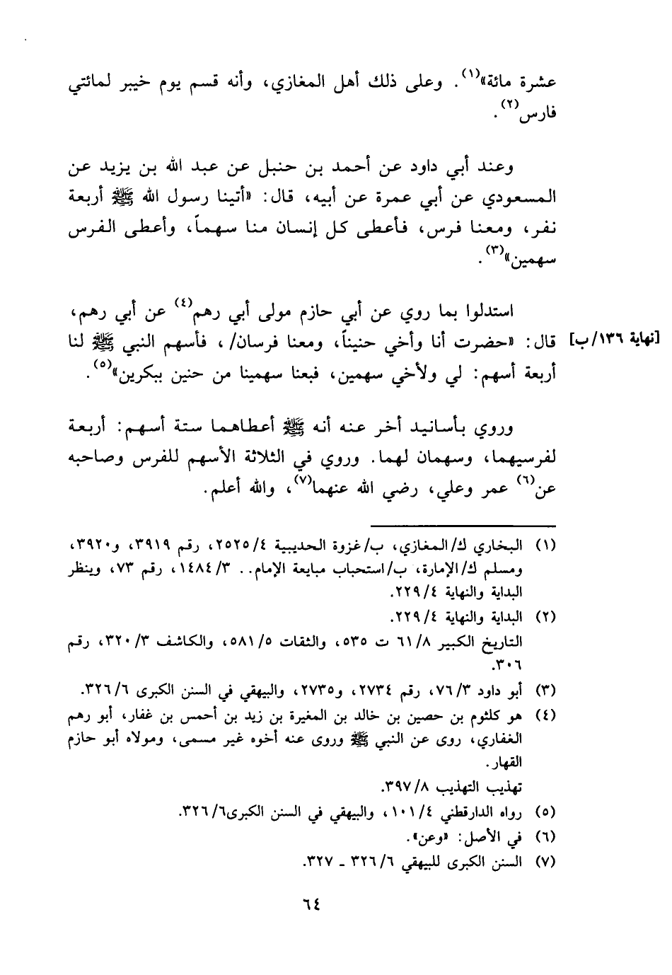 وَرُوِيَ بأسانيد أخر عَنهُ انه - صَلَّى اللَّهُ عَلَيْهِ وَسَلَّم َ - أعطاهما سِتَّة أسْهم: أَرْبَعَة لفرسيهما، وسهمان لَهما. وَرُوِيَ فِي الثَّلَاثَة الأسهم للْفرس وَصَاحبه عَن عمر وَعلي، رَضِي الله عَنْهُمَا، وَالله أعلم.