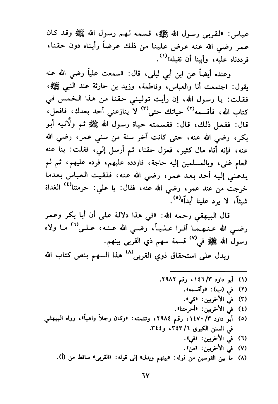 قَالَ الْبَيْهَقِيّ رَحمَه الله: " فِي هَذَا دلَالَة على أَن أَبَا بكر وَعمر رَضِي الله عَنْهُمَا أقرا عليا، رَضِي الله عَنهُ، على مَا ولاه رَسُول الله - صَلَّى اللَّهُ عَلَيْهِ وَسَلَّم َ - فِي قسْمَة سهم ذِي الْقُرْبَى بَينهم.