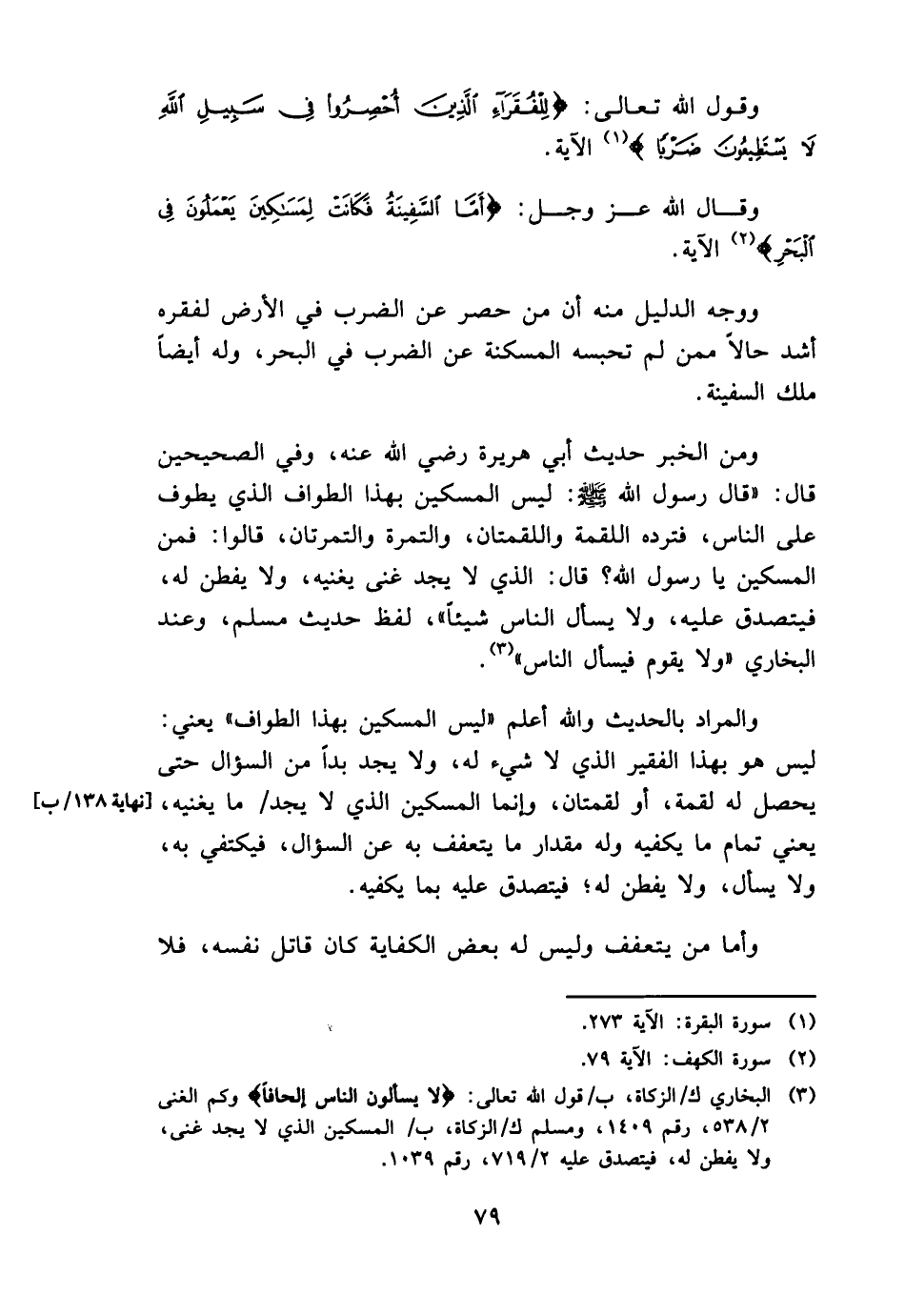 وَمن الْخَبَر حَدِيث أبي هُرَيْرَة رَضِي الله عَنهُ، وَفِي الصَّحِيحَيْنِ قَالَ: " قَالَ رَسُول الله - صَلَّى اللَّهُ عَلَيْهِ وَسَلَّم َ -: لَيْسَ الْمِسْكِين بِهَذَا الطّواف الَّذِي يطوف على النَّاس، فَتَردهُ اللُّقْمَة وَاللُّقْمَتَانِ، وَالتَّمْرَة وَالتَّمْرَتَانِ، قَالُوا: فَمن الْمِسْكِين يَا رَسُول الله؟ قَالَ: الَّذِي لَا يجد غنى يُغْنِيه، وَلَا يفْطن لَهُ، فَيتَصَدَّق عَلَيْهِ، وَلَا يسْأَل النَّاس شَيْئا "، لفظ حَدِيث مُسلم، وَعند البُخَارِيّ " وَلَا يقوم فَيسْأَل النَّاس ".