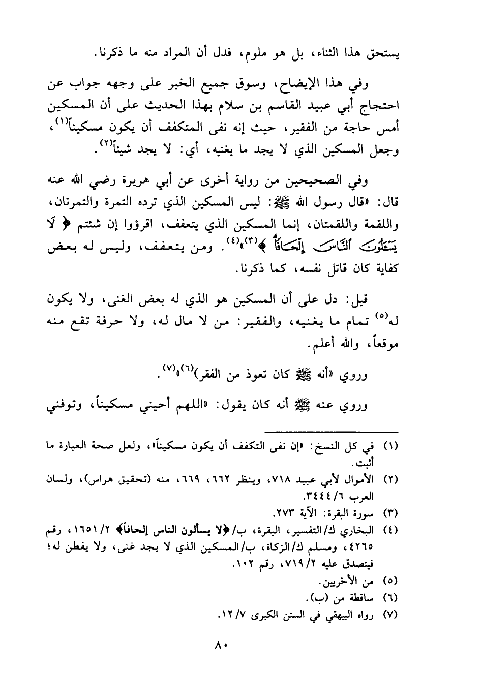 وَفِي هَذَا الْإِيضَاح، وسوق جَمِيع الْخَبَر على وَجهه جَوَاب عَن احتجاج أبي عبيد الْقَاسِم بن سَلام بِهَذَا الحَدِيث على أَن الْمِسْكِين أمس حَاجَة من الْفَقِير، حَيْثُ إِنَّه نفى المتكفف أَن يكون مِسْكينا، وَجعل الْمِسْكِين الَّذِي لَا يجد مَا يُغْنِيه، أَي: لَا يجد شَيْئا.