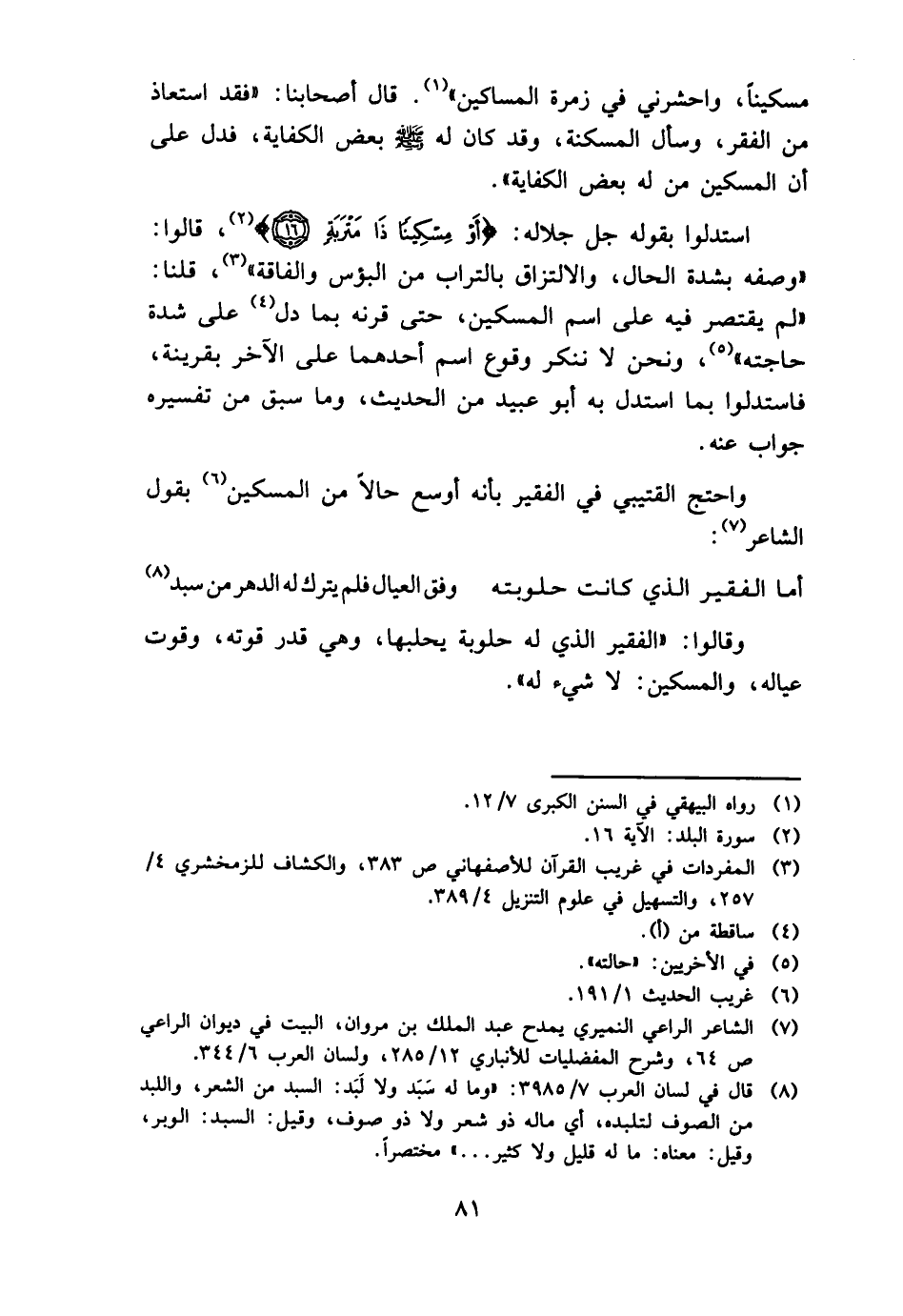 وَقَالُوا: " الْفَقِير الَّذِي لَهُ حلوبة يحلبها، وَهِي قدر قوته، وقوت عِيَاله، والمسكين: لَا شَيْء لَهُ ".