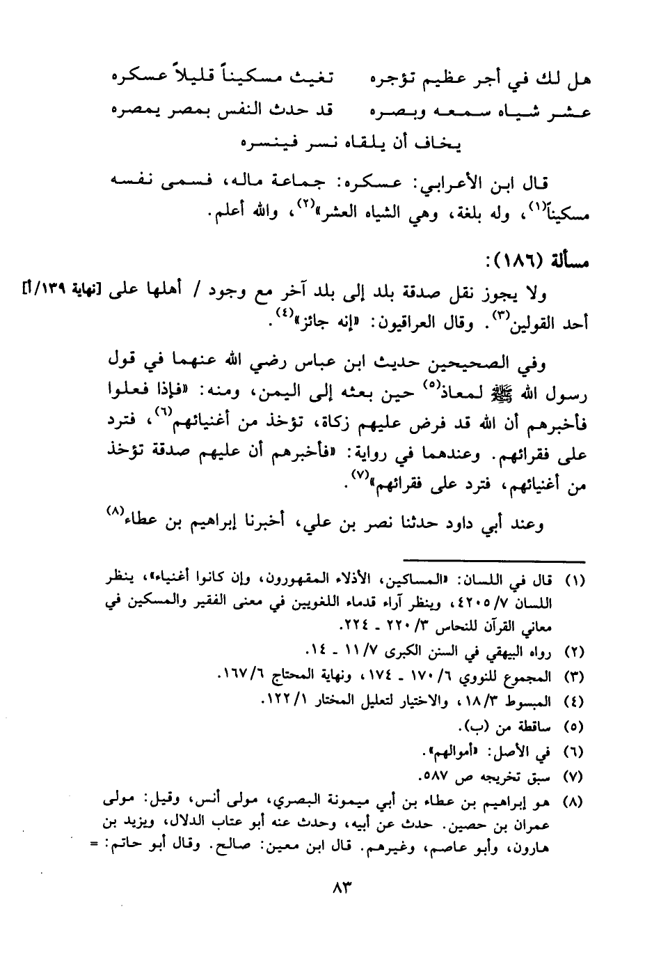 وَلَا يجوز نقل صَدَقَة بلد إِلَى بلد آخر مَعَ وجود / أَهلهَا على أحد الْقَوْلَيْنِ. وَقَالَ الْعِرَاقِيُّونَ: " إِنَّه جَائِز ".