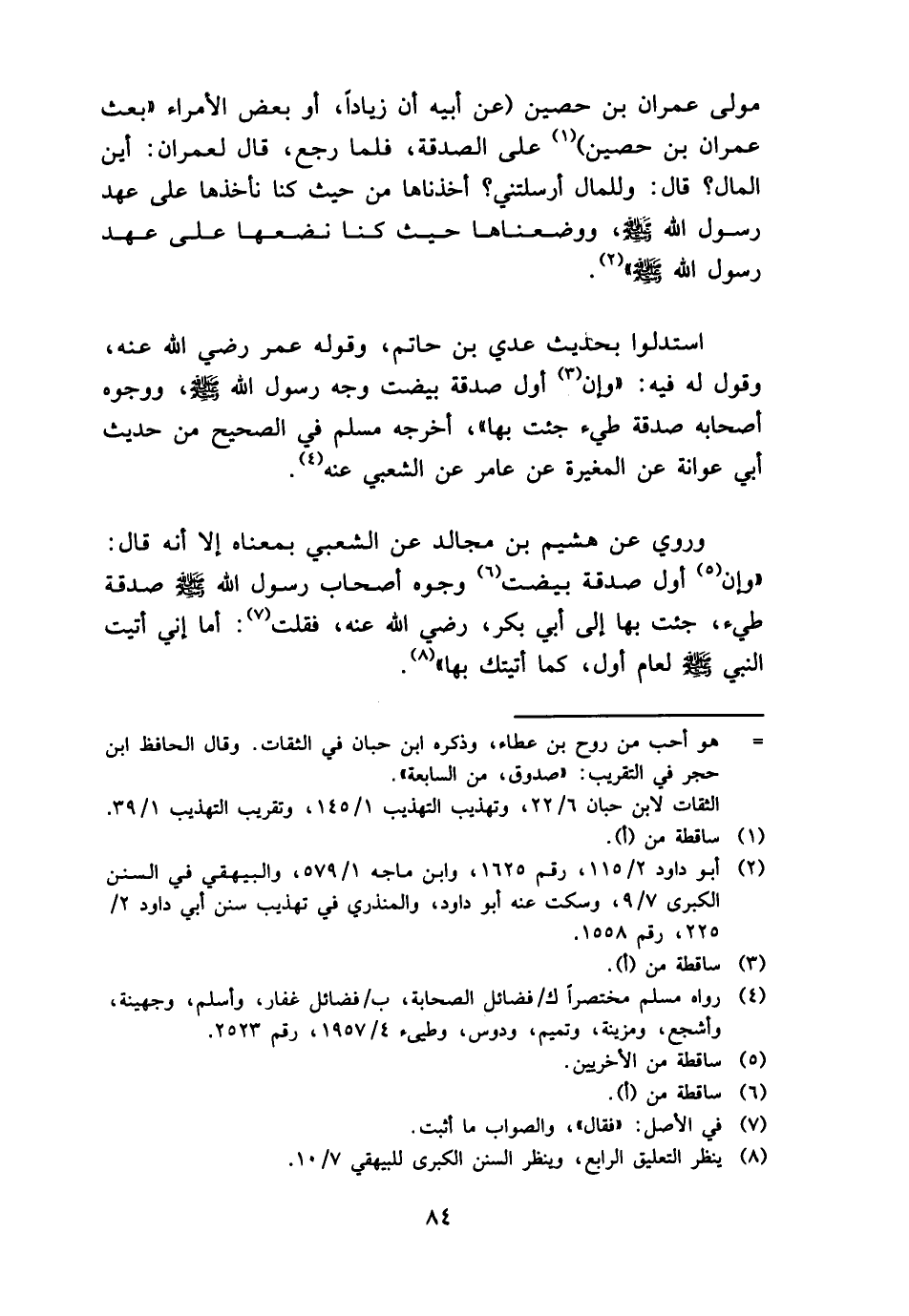 مولى عمرَان بن حُصَيْن (عَن أَبِيه أَن زيادا، أَو بعض الْأُمَرَاء " بعث عمرَان بن حُصَيْن) على الصَّدَقَة، فَلَمَّا رَجَعَ، قَالَ لعمران: أَيْن رَسُول الله - صَلَّى اللَّهُ عَلَيْهِ وَسَلَّم َ -، ووضعناها حَيْثُ كُنَّا نضعها على عهد رَسُول الله - صَلَّى اللَّهُ عَلَيْهِ وَسَلَّم َ - ".