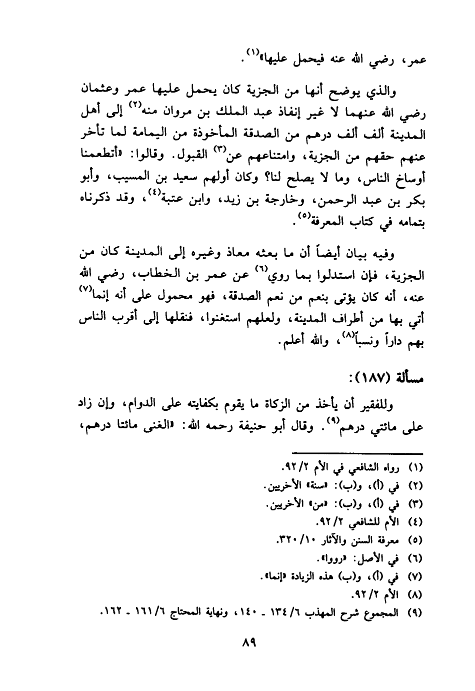 وَالَّذِي يُوضح أَنَّهَا من الْجِزْيَة كَانَ يحمل عَلَيْهَا عمر وَعُثْمَان رَضِي الله عَنْهُمَا لَا غير إِنْفَاذ عبد الْملك بن مَرْوَان مِنْهُ إِلَى أهل الْمَدِينَة ألف ألف دِرْهَم من الصَّدَقَة الْمَأْخُوذَة من الْيَمَامَة لما تَأَخّر عَنْهُم حَقهم من الْجِزْيَة، وامتناعهم عَن الْقبُول. وَقَالُوا: " أتطعمنا أوساخ النَّاس، وَمَا لَا يصلح لنا؟ وَكَانَ أَوَّلهمْ سعيد بن الْمسيب، وَأَبُو بكر بن عبد الرَّحْمَن، وخارجة بن زيد، وَابْن عتبَة، وَقد ذَكرْنَاهُ بِتَمَامِهِ فِي كتاب الْمعرفَة.